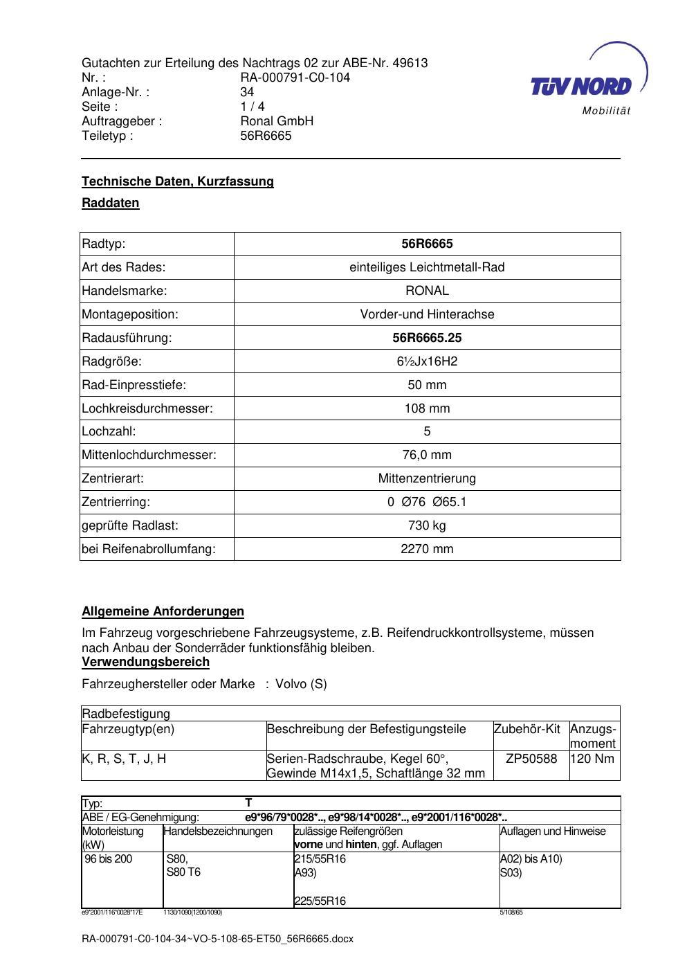 Dieses Gutachten (abe) bezieht sich auf die Alufelge Ronal 56R6665 in der Ausführung ET 0, Mittenloch 0 mm (KBA 49613). Im PDF findest du typischerweise zulässige Reifengrößen, Auflagen/Anbauhinweise und – je nach Dokument – Hinweise zur Eintragung.
