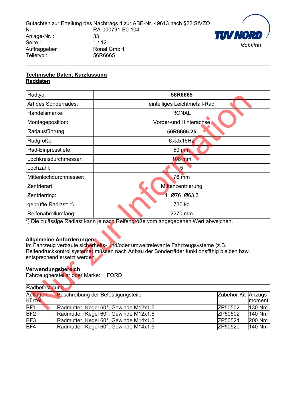 Dieses Gutachten (abe) bezieht sich auf die Alufelge Ronal 56R in der Ausführung ET 0, Mittenloch 0 mm (KBA 49613). Im PDF findest du typischerweise zulässige Reifengrößen, Auflagen/Anbauhinweise und – je nach Dokument – Hinweise zur Eintragung.