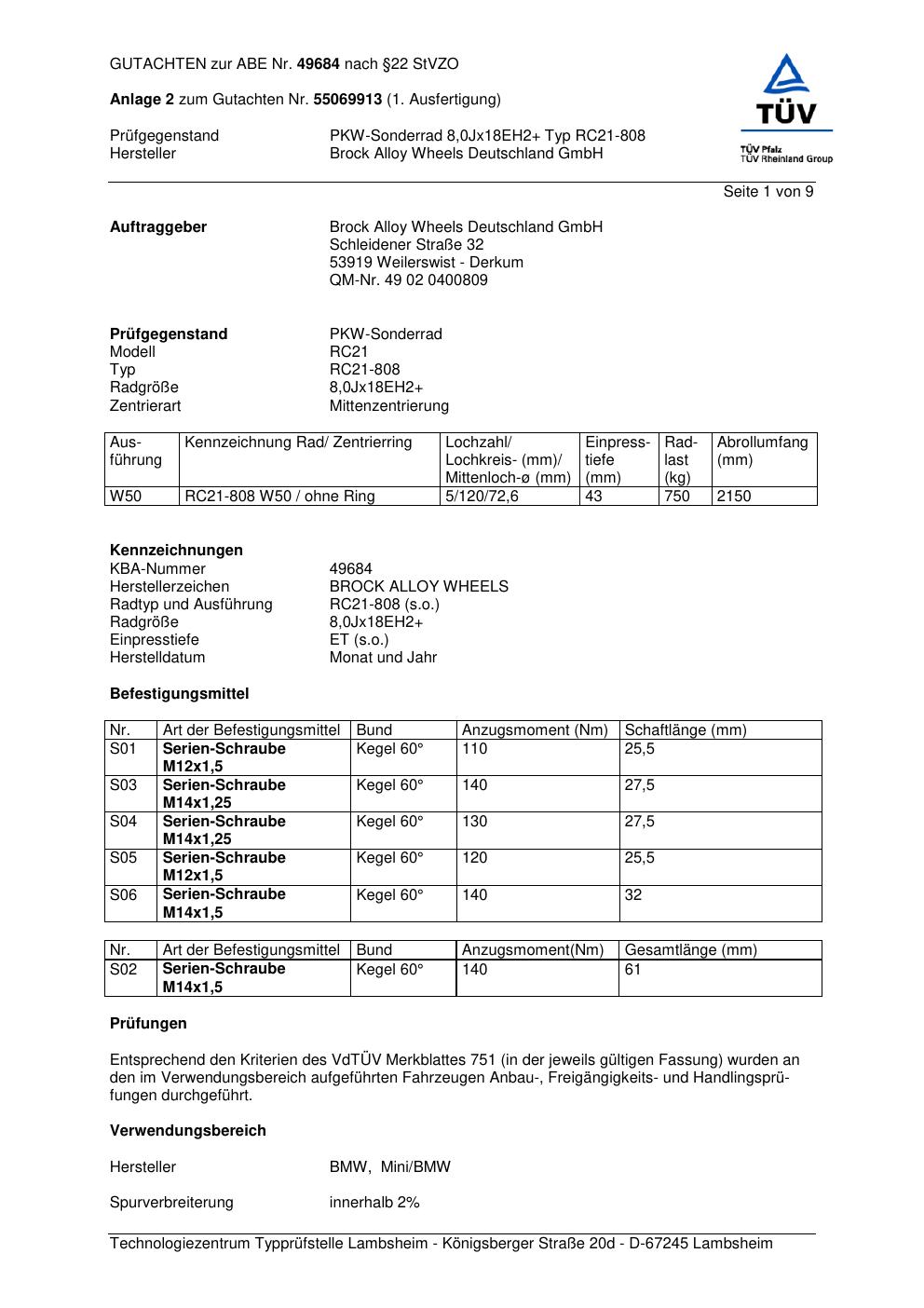 Felgengutachten / abe für Alufelgen Brock RC21-8 08 (8Jx18 ET 0, Mittenloch 0 mm) mit KBA 49684 (Zertifikatsnummer 49684). Hier kostenlos als PDF herunterladen. Der Download-Link ist 24 Stunden gültig und kann bis zu zwei Mal verwendet werden.
