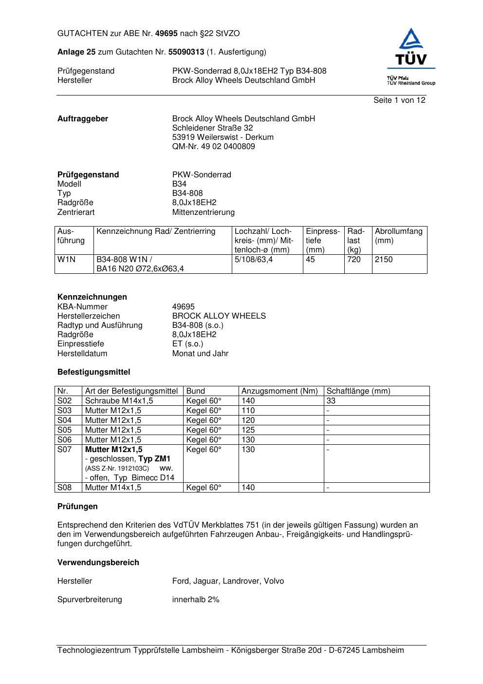 Dieses Gutachten (abe) bezieht sich auf die Alufelge Brock B34-808 in der Ausführung ET 0, Mittenloch 0 mm (KBA 49695). Im PDF findest du typischerweise zulässige Reifengrößen, Auflagen/Anbauhinweise und – je nach Dokument – Hinweise zur Eintragung.