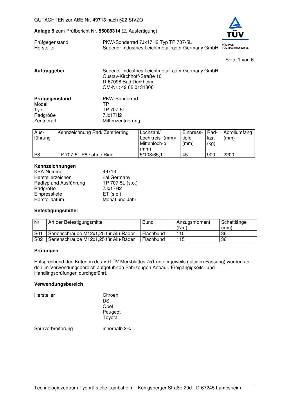 Dieses Gutachten (abe) bezieht sich auf die Alufelge brand-rial TP 707-5L in der Ausführung 7Jx17 ET 0, Mittenloch 0 mm (KBA 49713). Im PDF findest du typischerweise zulässige Reifengrößen, Auflagen/Anbauhinweise und – je nach Dokument – Hinweise zur Eintragung.
