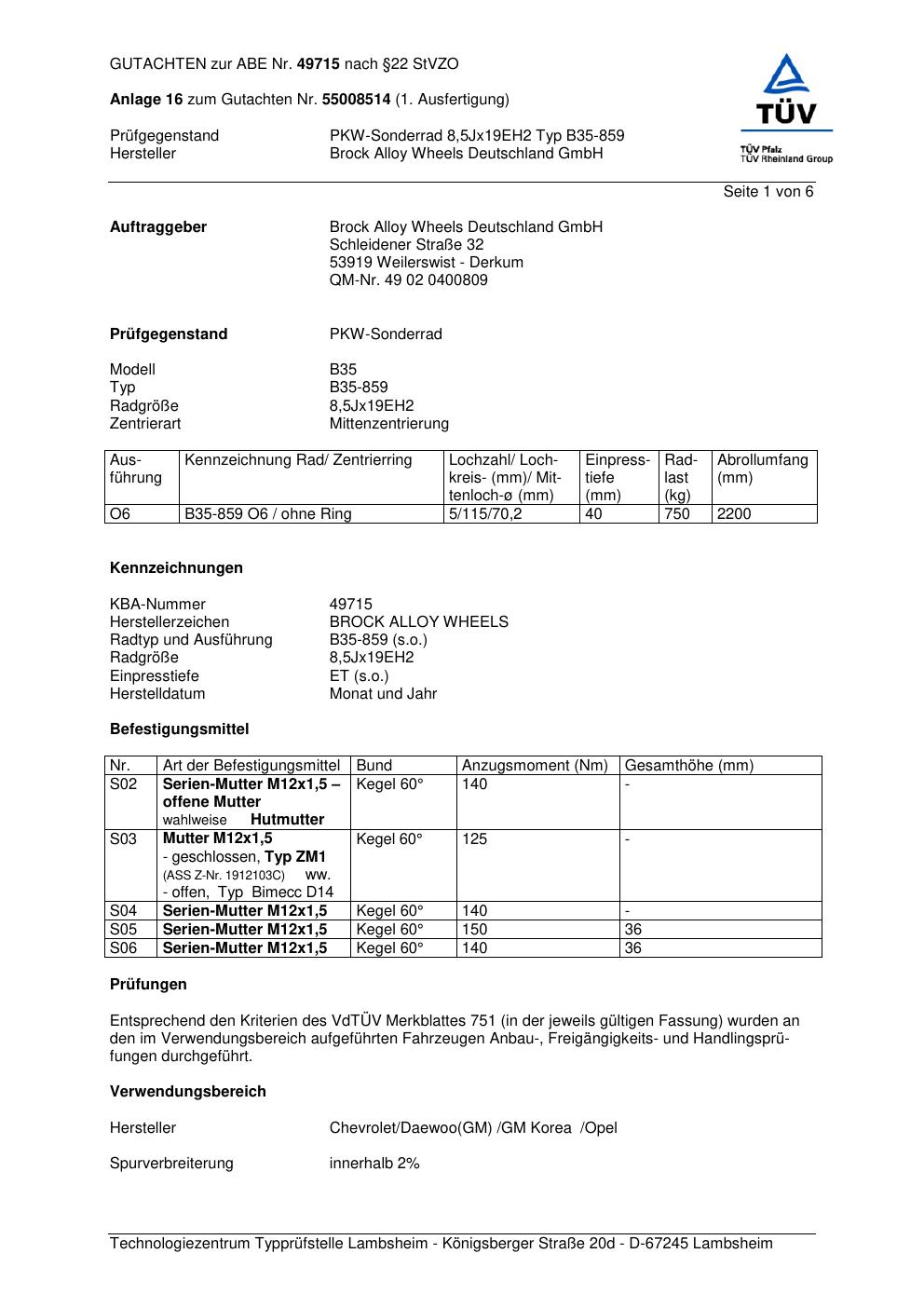 Dieses Gutachten (abe) bezieht sich auf die Alufelge Brock B35-859 in der Ausführung ET 0, Mittenloch 0 mm (KBA 49715). Im PDF findest du typischerweise zulässige Reifengrößen, Auflagen/Anbauhinweise und – je nach Dokument – Hinweise zur Eintragung.