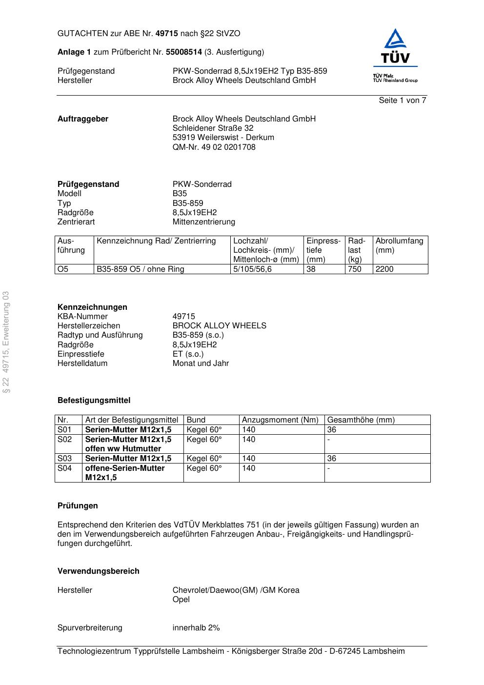 Dieses Gutachten (abe) bezieht sich auf die Alufelge Brock B35-859 in der Ausführung ET 0, Mittenloch 0 mm (KBA 49715). Im PDF findest du typischerweise zulässige Reifengrößen, Auflagen/Anbauhinweise und – je nach Dokument – Hinweise zur Eintragung.