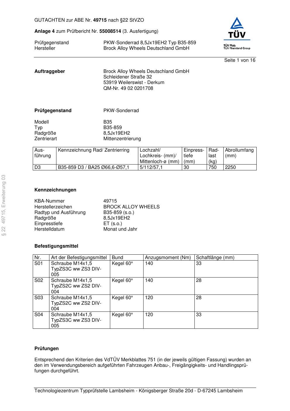 Dieses Gutachten (abe) bezieht sich auf die Alufelge Brock B35-859 in der Ausführung 8.5Jx19 ET 0, Mittenloch 0 mm (KBA 49715). Im PDF findest du typischerweise zulässige Reifengrößen, Auflagen/Anbauhinweise und – je nach Dokument – Hinweise zur Eintragung.