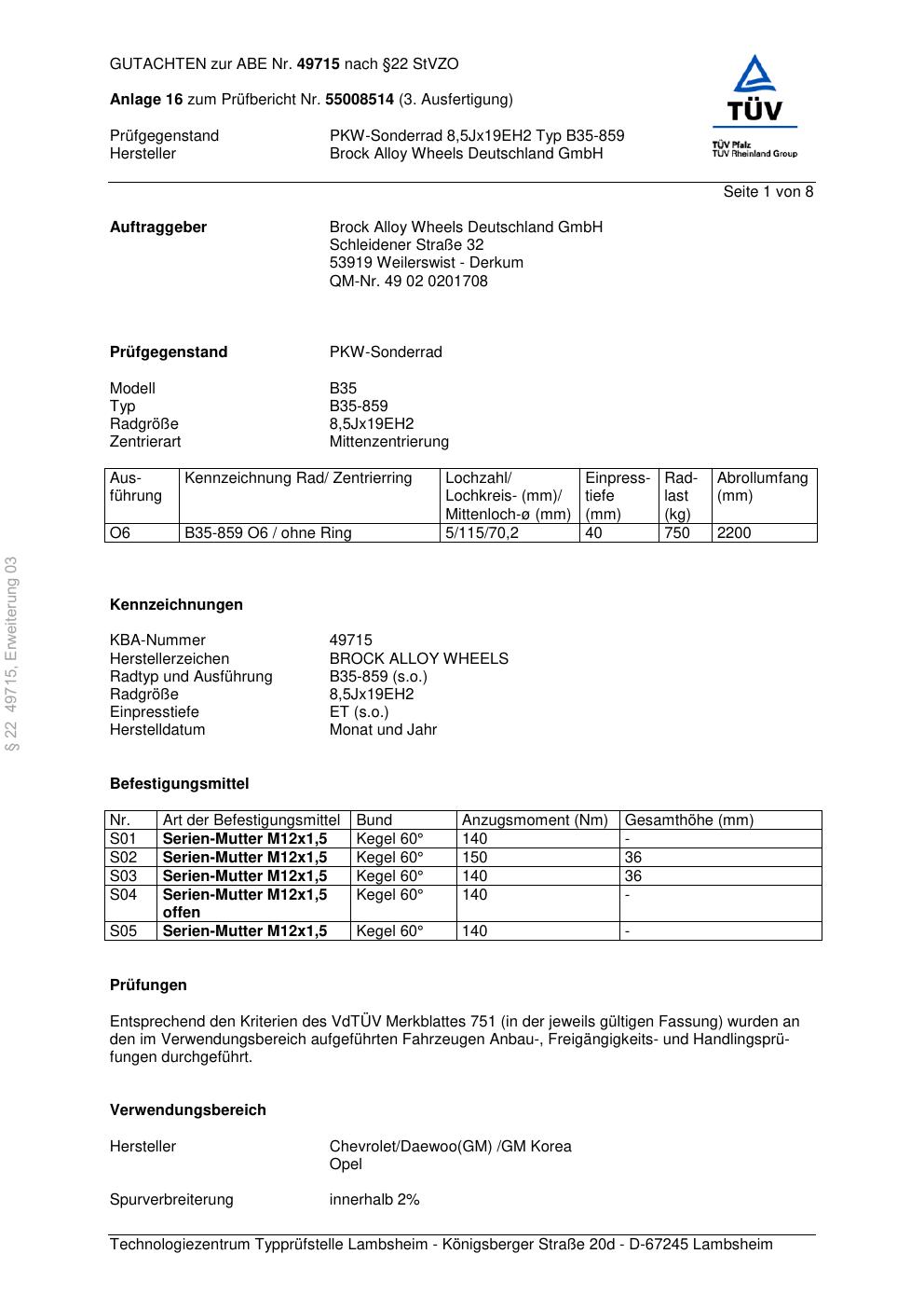 Dieses Gutachten (abe) bezieht sich auf die Alufelge Brock B35-859 in der Ausführung ET 0, Mittenloch 0 mm (KBA 49715). Im PDF findest du typischerweise zulässige Reifengrößen, Auflagen/Anbauhinweise und – je nach Dokument – Hinweise zur Eintragung.