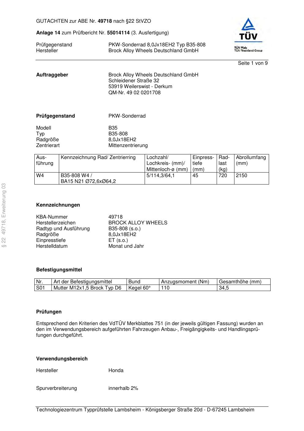 Dieses Gutachten (abe) bezieht sich auf die Alufelge Brock B35-808 in der Ausführung ET 0, Mittenloch 0 mm (KBA 49718). Im PDF findest du typischerweise zulässige Reifengrößen, Auflagen/Anbauhinweise und – je nach Dokument – Hinweise zur Eintragung.