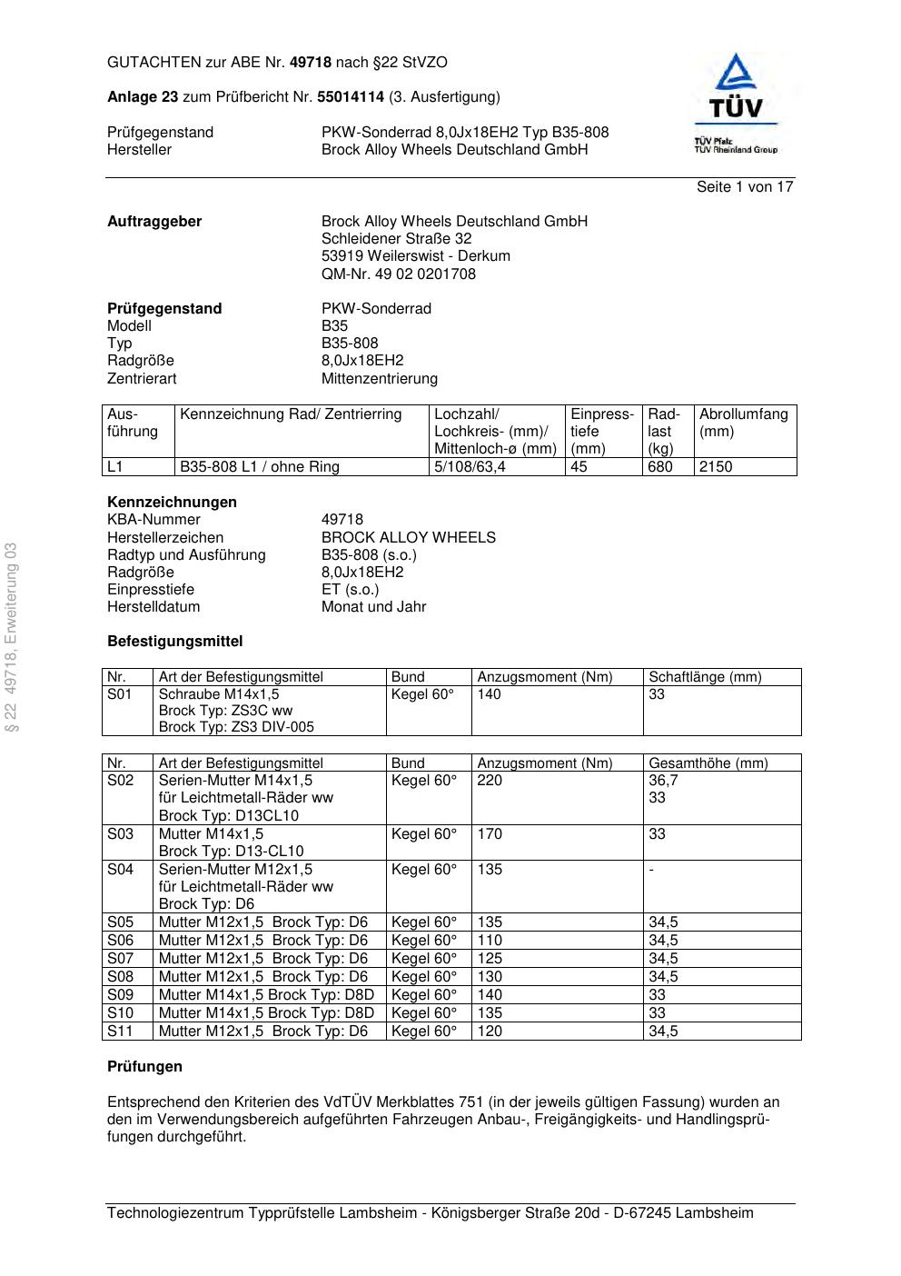 Dieses Gutachten (abe) bezieht sich auf die Alufelge Brock B35-808 in der Ausführung 8.5Jx21 ET 0, Mittenloch 0 mm (KBA 49718). Im PDF findest du typischerweise zulässige Reifengrößen, Auflagen/Anbauhinweise und – je nach Dokument – Hinweise zur Eintragung.