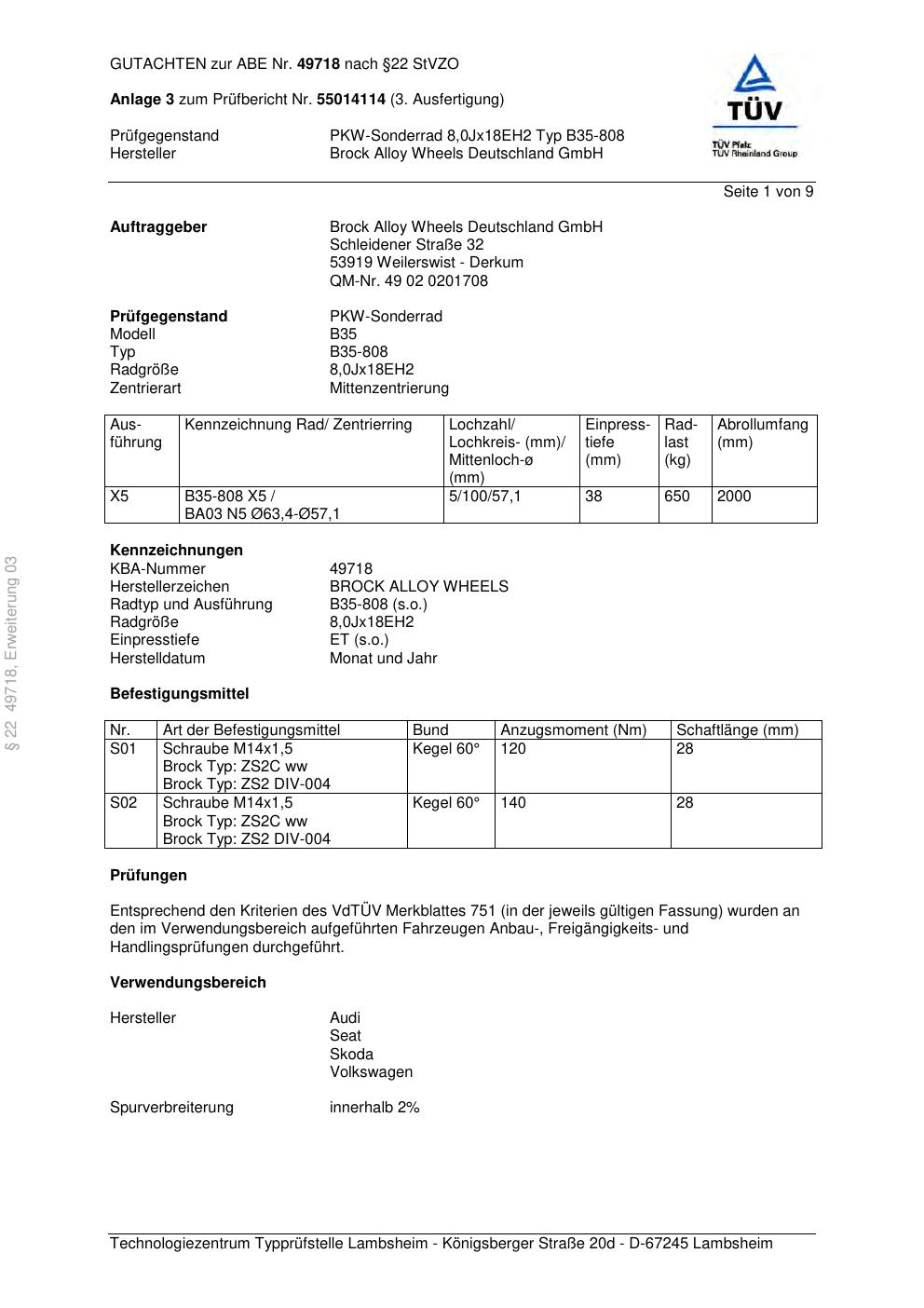 Dieses Gutachten (abe) bezieht sich auf die Alufelge Brock B35-808 in der Ausführung ET 0, Mittenloch 0 mm (KBA 49718). Im PDF findest du typischerweise zulässige Reifengrößen, Auflagen/Anbauhinweise und – je nach Dokument – Hinweise zur Eintragung.