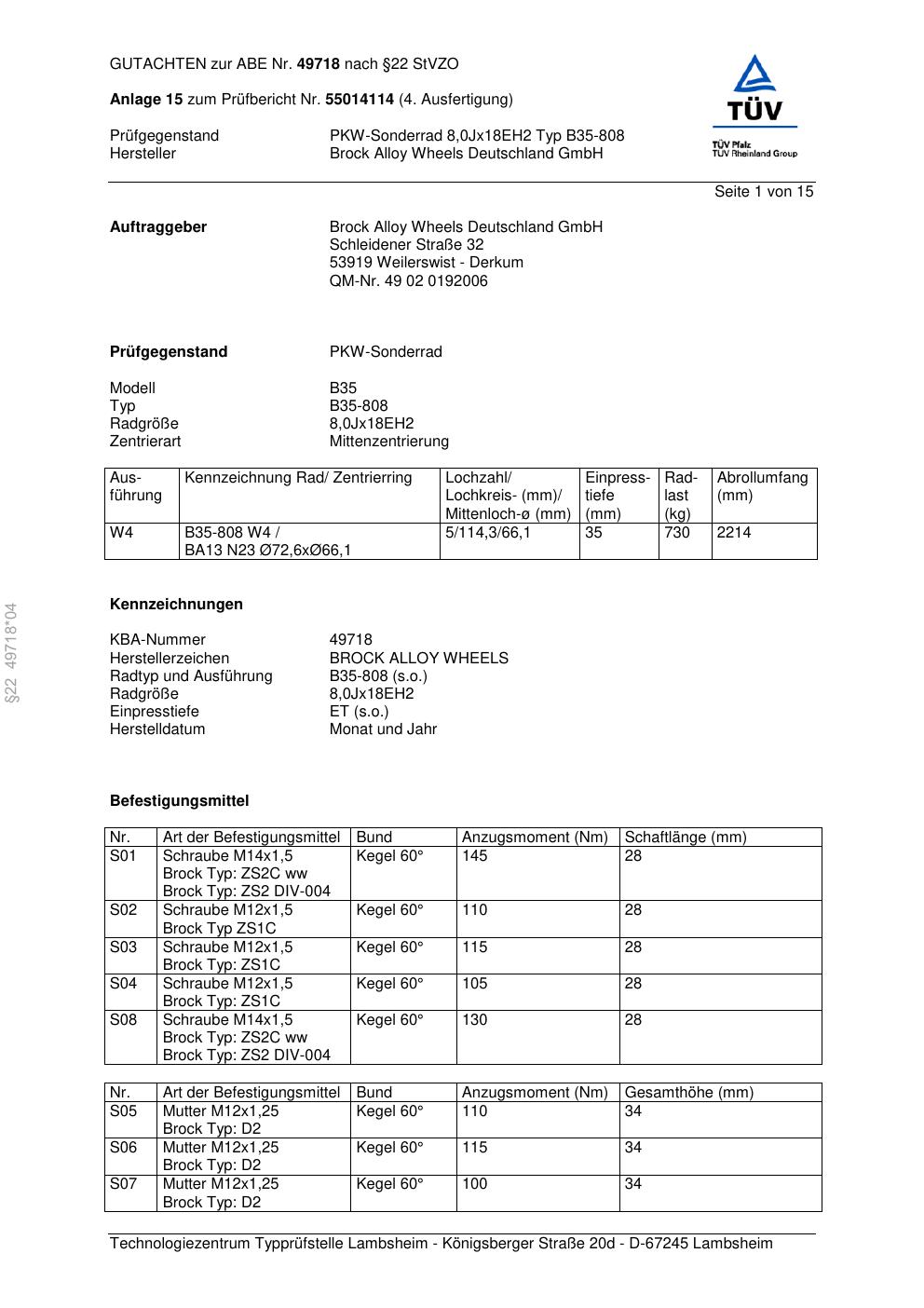 Dieses Gutachten (abe) bezieht sich auf die Alufelge Brock B35-808 in der Ausführung ET 0, Mittenloch 0 mm (KBA 49718). Im PDF findest du typischerweise zulässige Reifengrößen, Auflagen/Anbauhinweise und – je nach Dokument – Hinweise zur Eintragung.