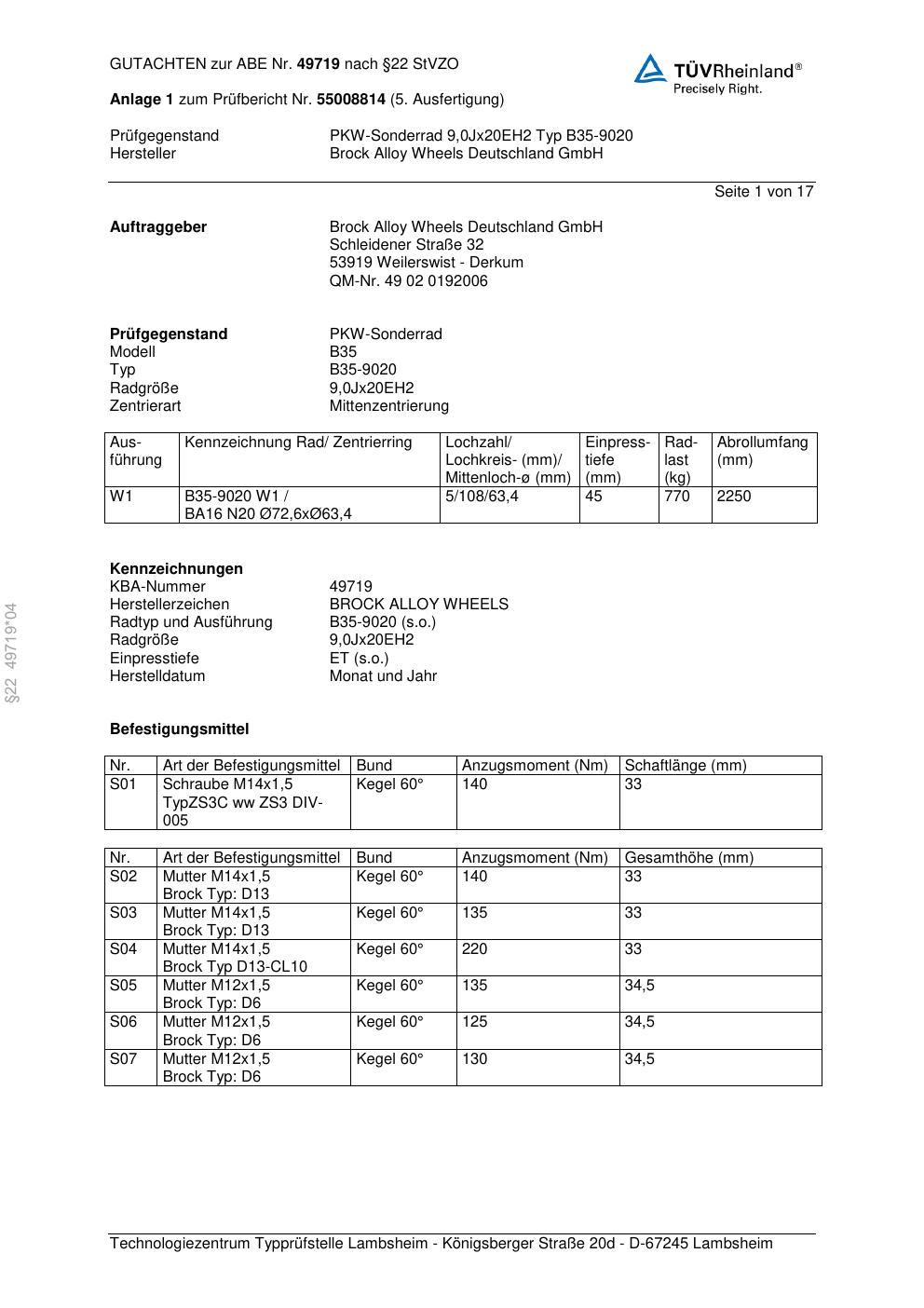 Felgengutachten / abe für Alufelgen Brock B35-902 0 (8.5Jx21 ET 0, Mittenloch 0 mm) mit KBA 49719 (Zertifikatsnummer 49719). Hier kostenlos als PDF herunterladen. Der Download-Link ist 24 Stunden gültig und kann bis zu zwei Mal verwendet werden.