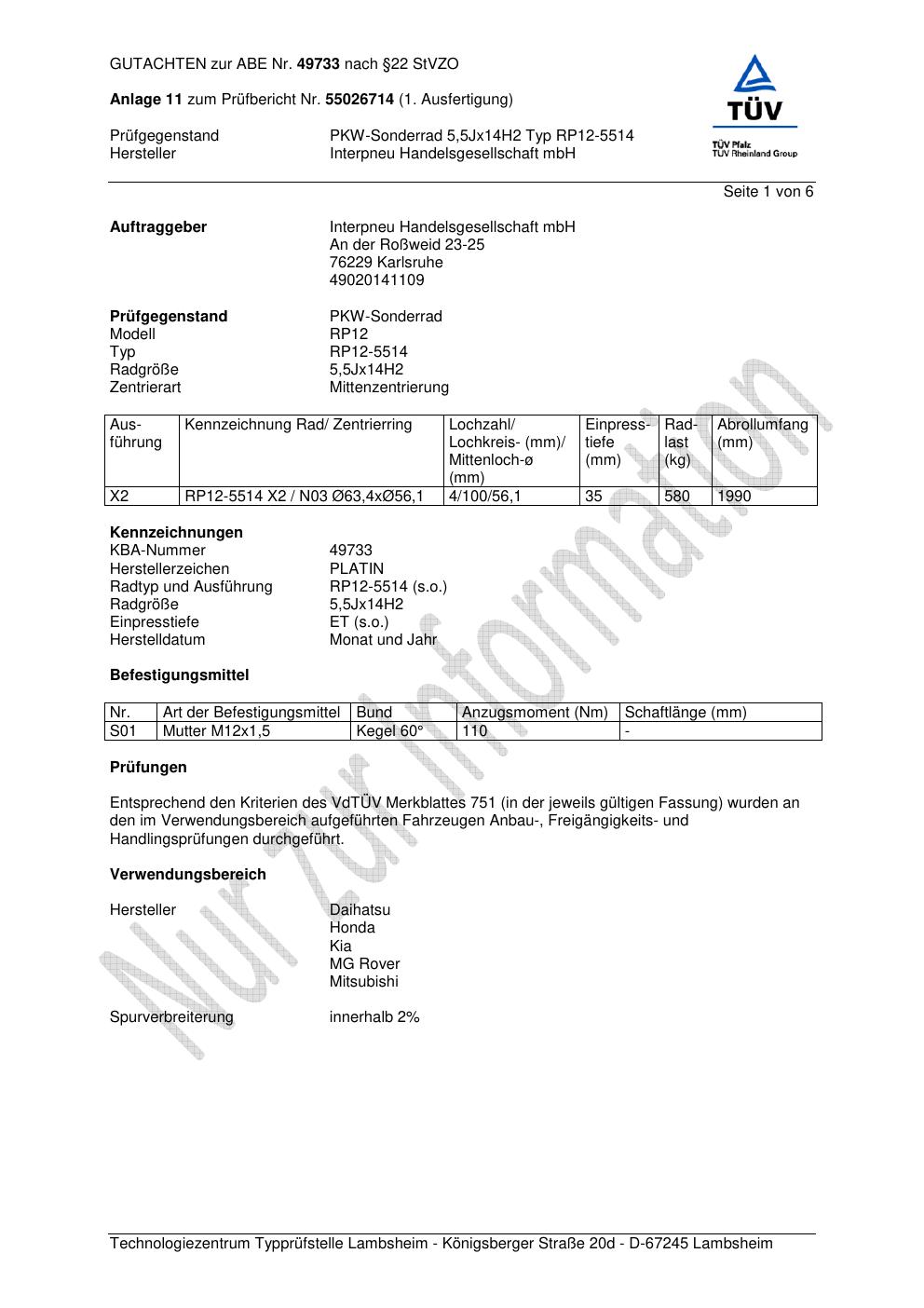 Dieses Gutachten (abe) bezieht sich auf die Alufelge Platin RP12-551 4 in der Ausführung 5.5Jx14 ET 0, Mittenloch 0 mm (KBA 49733). Im PDF findest du typischerweise zulässige Reifengrößen, Auflagen/Anbauhinweise und – je nach Dokument – Hinweise zur Eintragung.