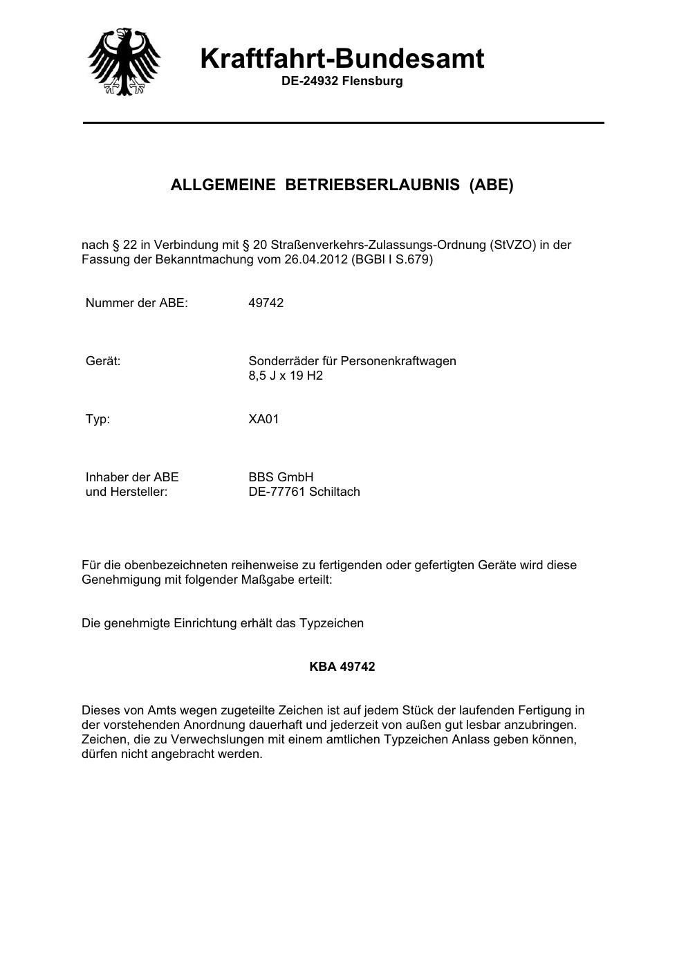 Dieses Gutachten (abe) bezieht sich auf die Alufelge BBS XA01 in der Ausführung 8.5Jx19 ET 0, Mittenloch 0 mm (KBA 49742). Im PDF findest du typischerweise zulässige Reifengrößen, Auflagen/Anbauhinweise und – je nach Dokument – Hinweise zur Eintragung.