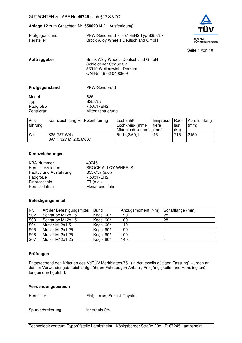 Dieses Gutachten (abe) bezieht sich auf die Alufelge Brock B35-757 in der Ausführung ET 0, Mittenloch 0 mm (KBA 49745). Im PDF findest du typischerweise zulässige Reifengrößen, Auflagen/Anbauhinweise und – je nach Dokument – Hinweise zur Eintragung.