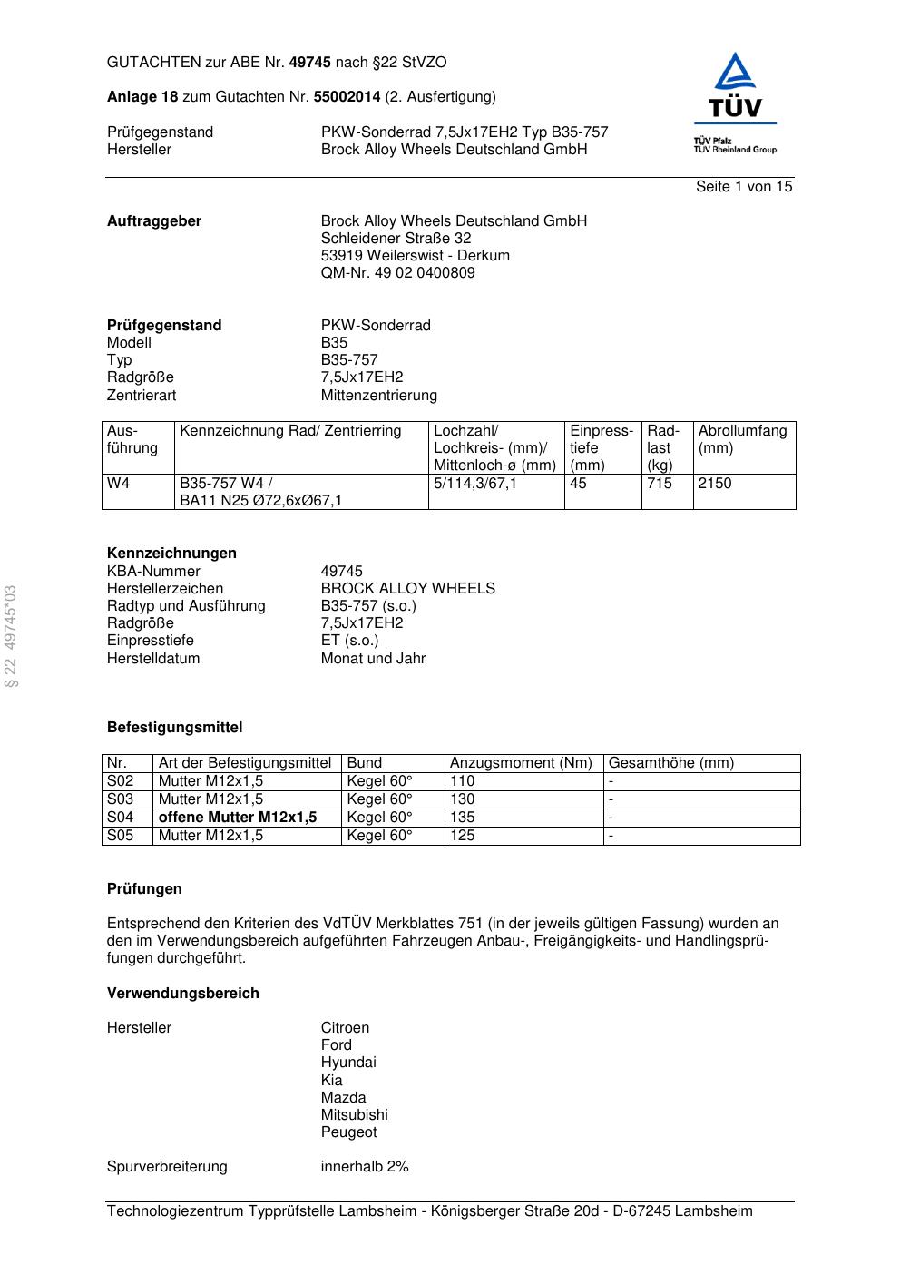 Dieses Gutachten (abe) bezieht sich auf die Alufelge Brock B35-757 in der Ausführung ET 0, Mittenloch 0 mm (KBA 49745). Im PDF findest du typischerweise zulässige Reifengrößen, Auflagen/Anbauhinweise und – je nach Dokument – Hinweise zur Eintragung.