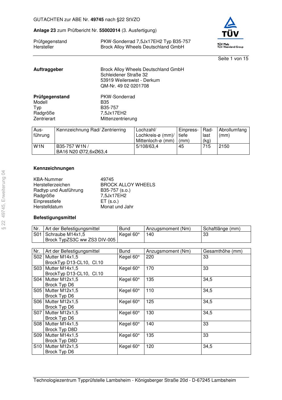 Dieses Gutachten (abe) bezieht sich auf die Alufelge Brock B35-757 in der Ausführung ET 0, Mittenloch 0 mm (KBA 49745). Im PDF findest du typischerweise zulässige Reifengrößen, Auflagen/Anbauhinweise und – je nach Dokument – Hinweise zur Eintragung.