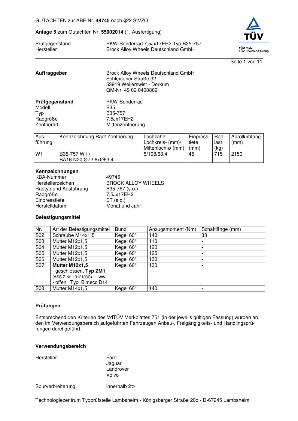 Dieses Gutachten (abe) bezieht sich auf die Alufelge Brock B35-757 in der Ausführung ET 0, Mittenloch 0 mm (KBA 49745). Im PDF findest du typischerweise zulässige Reifengrößen, Auflagen/Anbauhinweise und – je nach Dokument – Hinweise zur Eintragung.