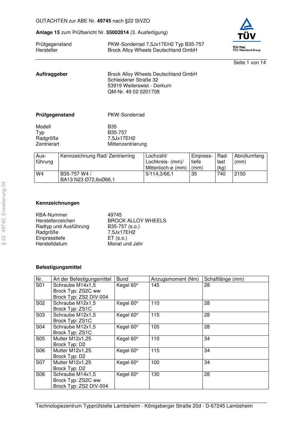 Dieses Gutachten (abe) bezieht sich auf die Alufelge Brock B35-757 in der Ausführung ET 0, Mittenloch 0 mm (KBA 49745). Im PDF findest du typischerweise zulässige Reifengrößen, Auflagen/Anbauhinweise und – je nach Dokument – Hinweise zur Eintragung.