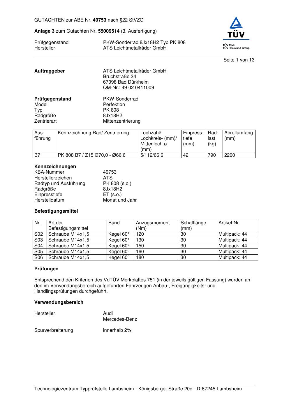 Dieses Gutachten (abe) bezieht sich auf die Alufelge ATS PK 808 in der Ausführung 8Jx18 ET 0, Mittenloch 0 mm (KBA 49753). Im PDF findest du typischerweise zulässige Reifengrößen, Auflagen/Anbauhinweise und – je nach Dokument – Hinweise zur Eintragung.