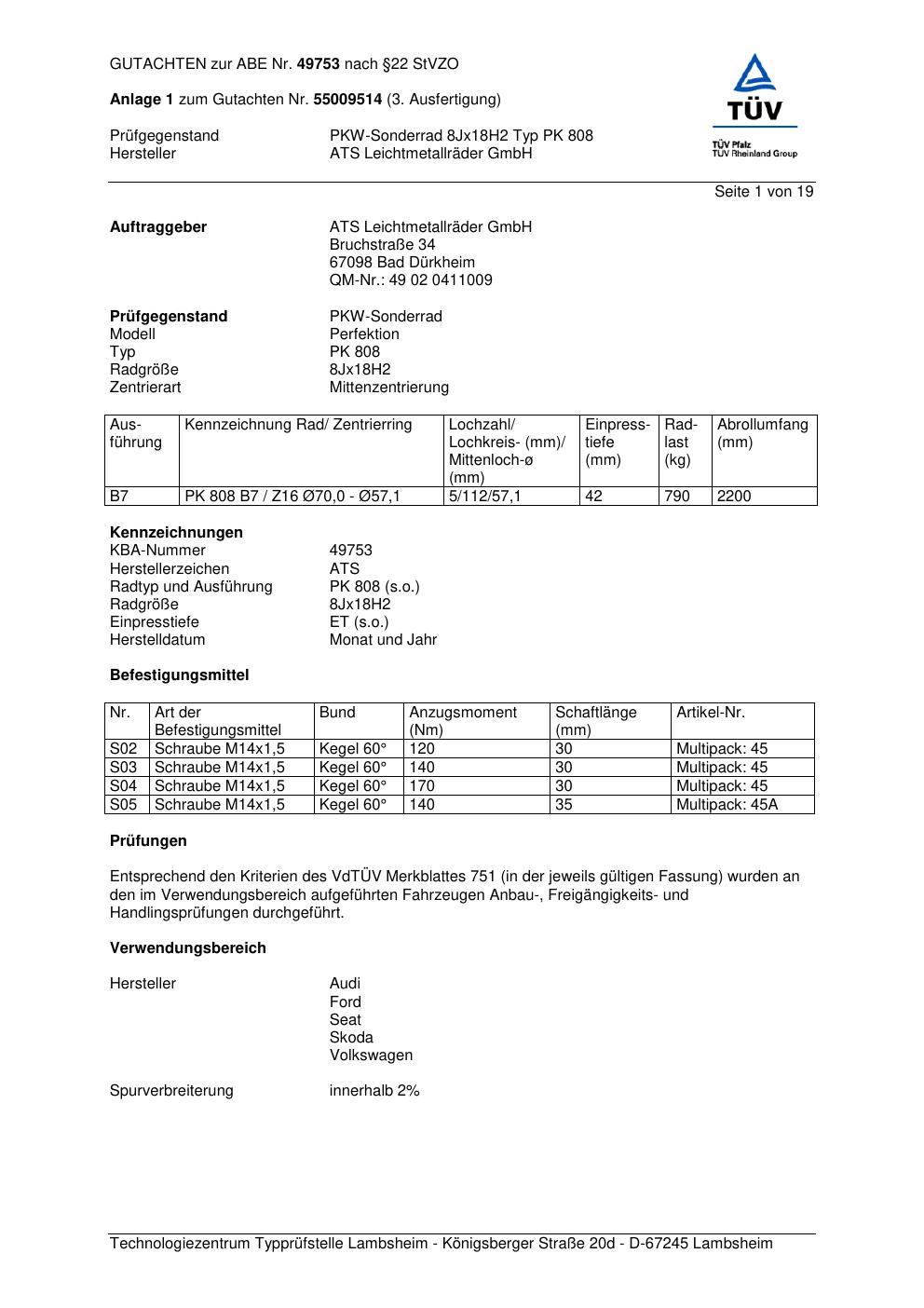 Dieses Gutachten (abe) bezieht sich auf die Alufelge ATS PK 808 in der Ausführung 8Jx18 ET 0, Mittenloch 0 mm (KBA 49753). Im PDF findest du typischerweise zulässige Reifengrößen, Auflagen/Anbauhinweise und – je nach Dokument – Hinweise zur Eintragung.