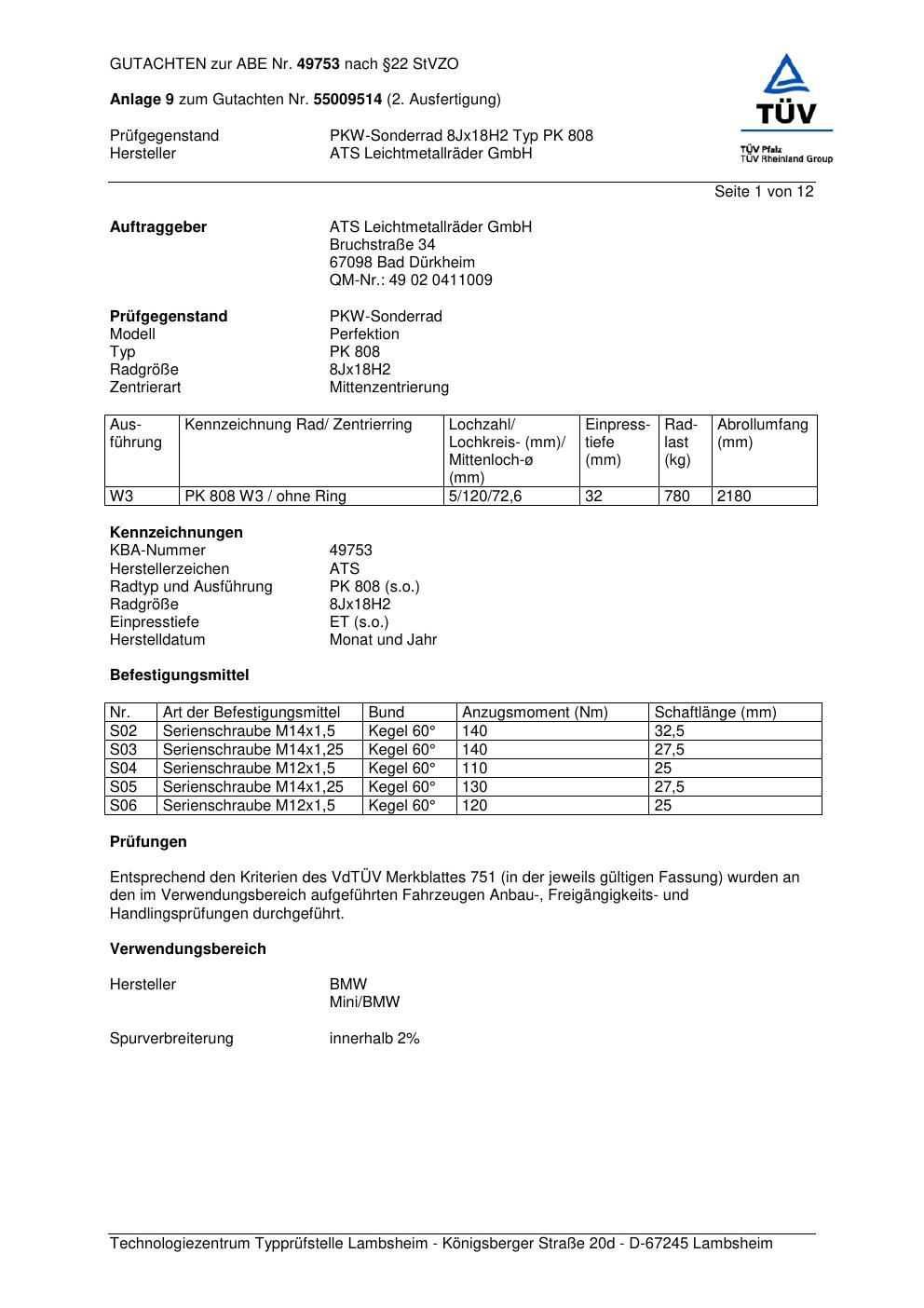 Dieses Gutachten (abe) bezieht sich auf die Alufelge ATS PK 808 in der Ausführung 8Jx18 ET 0, Mittenloch 0 mm (KBA 49753). Im PDF findest du typischerweise zulässige Reifengrößen, Auflagen/Anbauhinweise und – je nach Dokument – Hinweise zur Eintragung.