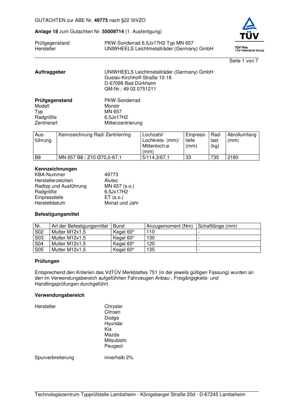 Dieses Gutachten (abe) bezieht sich auf die Alufelge ALUTEC MN 657 in der Ausführung 6.5Jx17 ET 0, Mittenloch 0 mm (KBA 49773). Im PDF findest du typischerweise zulässige Reifengrößen, Auflagen/Anbauhinweise und – je nach Dokument – Hinweise zur Eintragung.