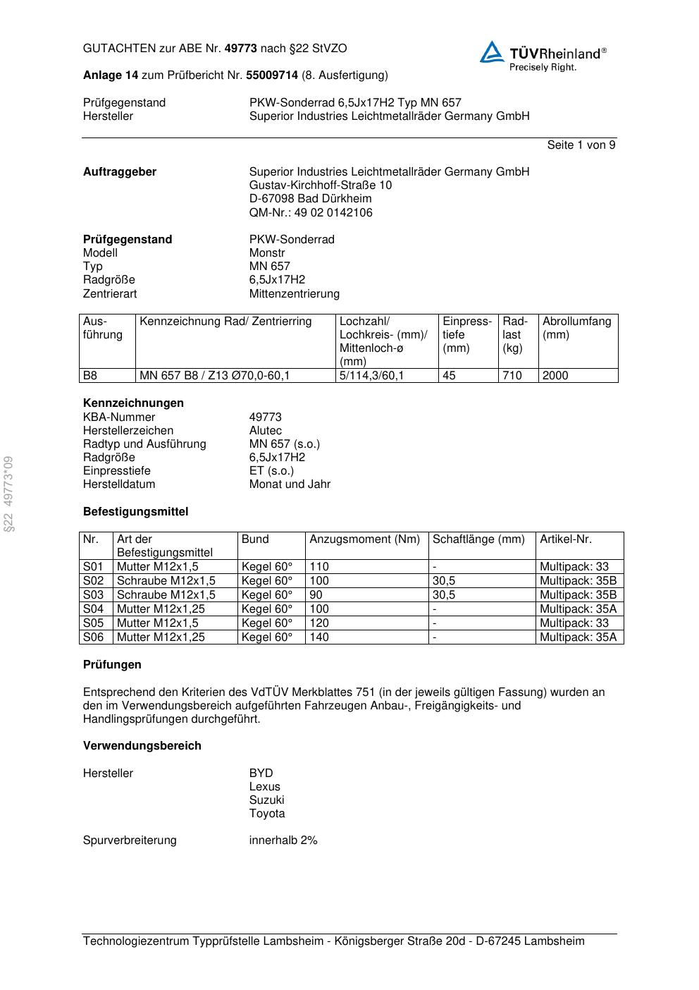 Dieses Gutachten (abe) bezieht sich auf die Alufelge ALUTEC MN 657 in der Ausführung 6.5Jx17 ET 0, Mittenloch 0 mm (KBA 49773). Im PDF findest du typischerweise zulässige Reifengrößen, Auflagen/Anbauhinweise und – je nach Dokument – Hinweise zur Eintragung.