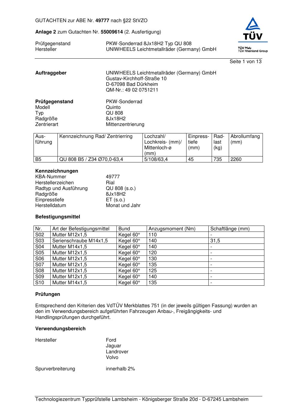 Dieses Gutachten (abe) bezieht sich auf die Alufelge brand-rial QU 808 in der Ausführung 8Jx18 ET 0, Mittenloch 0 mm (KBA 49777). Im PDF findest du typischerweise zulässige Reifengrößen, Auflagen/Anbauhinweise und – je nach Dokument – Hinweise zur Eintragung.