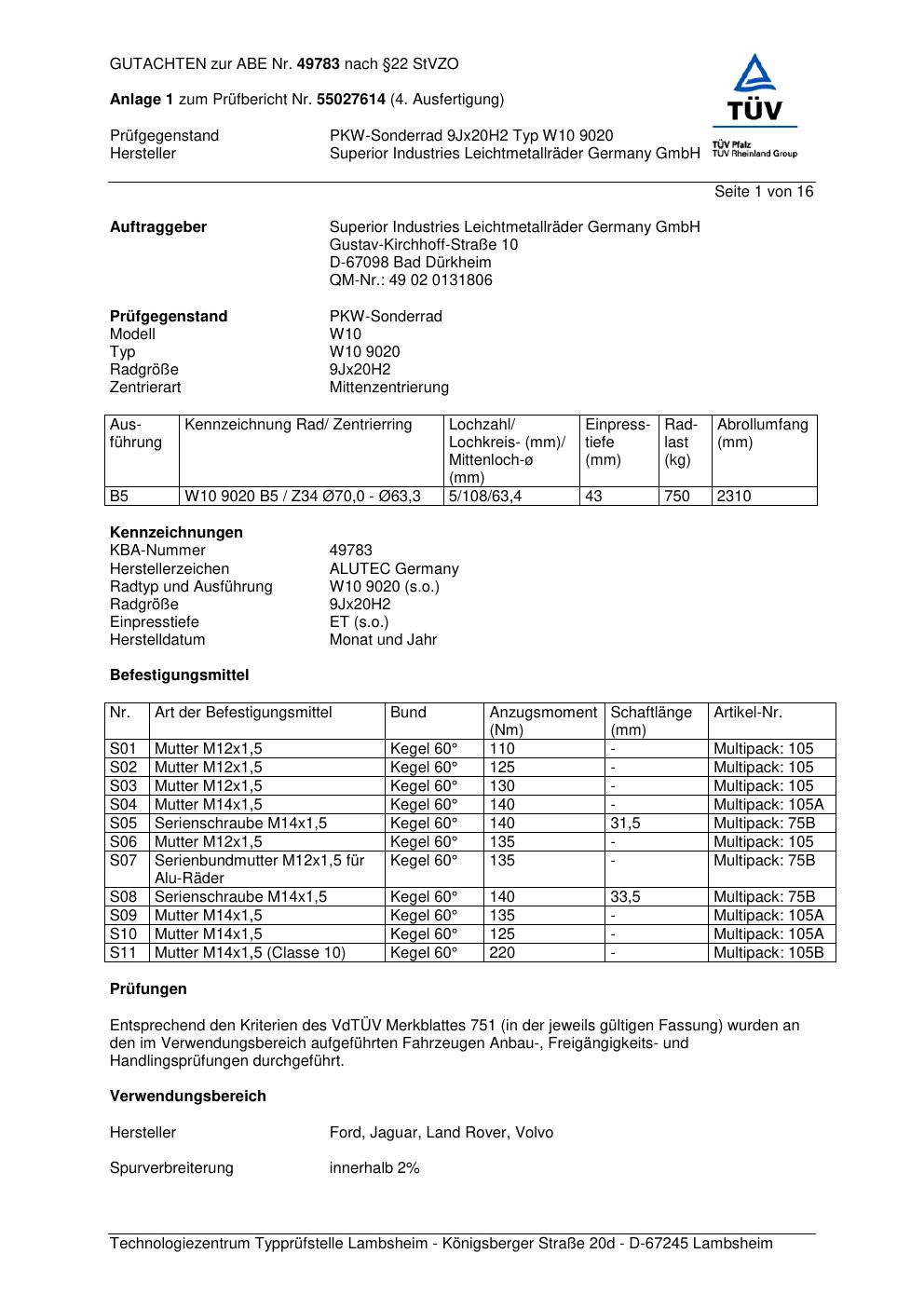 Dieses Gutachten (abe) bezieht sich auf die Alufelge ALUTEC W10 9020 in der Ausführung 9Jx2 ET 0, Mittenloch 0 mm (KBA 49783). Im PDF findest du typischerweise zulässige Reifengrößen, Auflagen/Anbauhinweise und – je nach Dokument – Hinweise zur Eintragung.