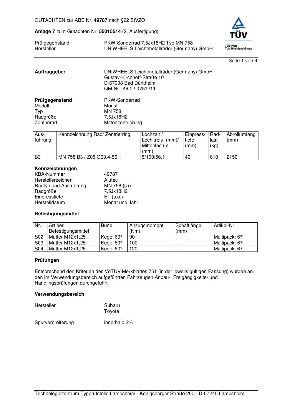Dieses Gutachten (abe) bezieht sich auf die Alufelge ALUTEC MN 758 in der Ausführung 7.5Jx18 ET 0, Mittenloch 0 mm (KBA 49787). Im PDF findest du typischerweise zulässige Reifengrößen, Auflagen/Anbauhinweise und – je nach Dokument – Hinweise zur Eintragung.