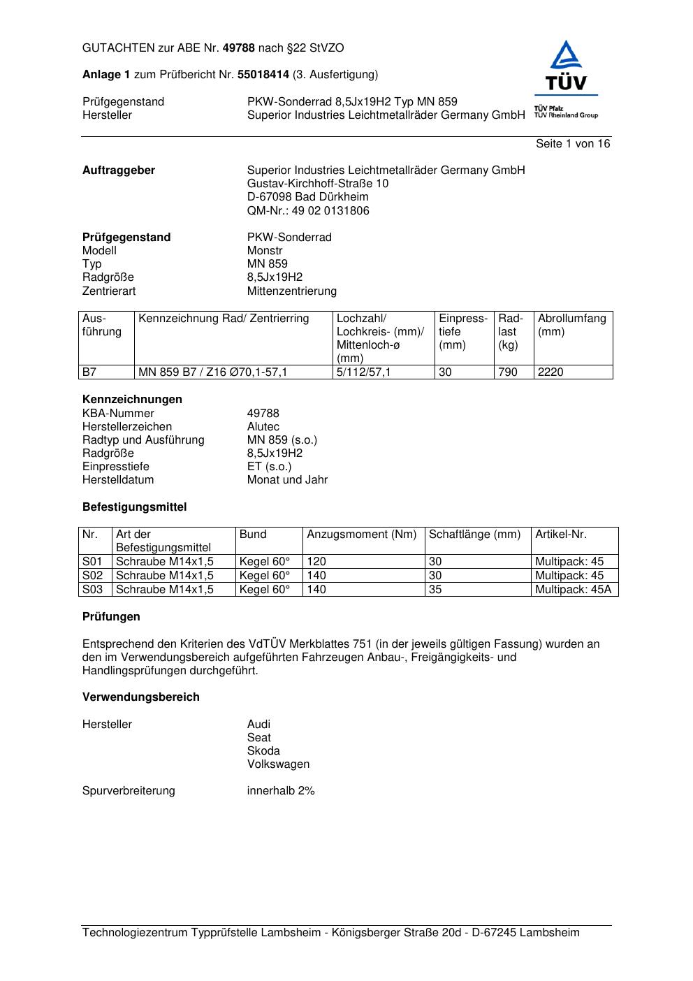 Felgengutachten / abe für Alufelgen ALUTEC MN 859 (8.5Jx19 ET 0, Mittenloch 0 mm) mit KBA 49788 (Zertifikatsnummer 49788). Hier kostenlos als PDF herunterladen. Der Download-Link ist 24 Stunden gültig und kann bis zu zwei Mal verwendet werden.