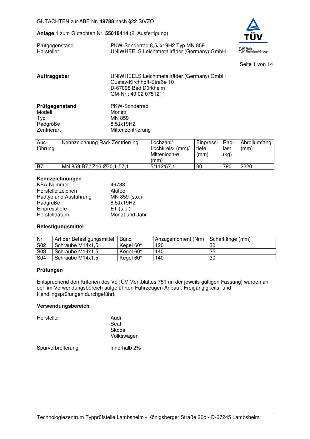 Dieses Gutachten (abe) bezieht sich auf die Alufelge ALUTEC MN 859 in der Ausführung 8.5Jx19 ET 0, Mittenloch 0 mm (KBA 49788). Im PDF findest du typischerweise zulässige Reifengrößen, Auflagen/Anbauhinweise und – je nach Dokument – Hinweise zur Eintragung.
