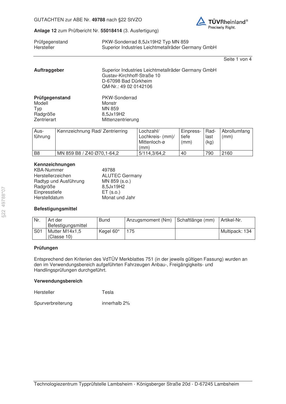 Dieses Gutachten (abe) bezieht sich auf die Alufelge ALUTEC MN 859 in der Ausführung 8.5Jx19 ET 0, Mittenloch 0 mm (KBA 49788). Im PDF findest du typischerweise zulässige Reifengrößen, Auflagen/Anbauhinweise und – je nach Dokument – Hinweise zur Eintragung.