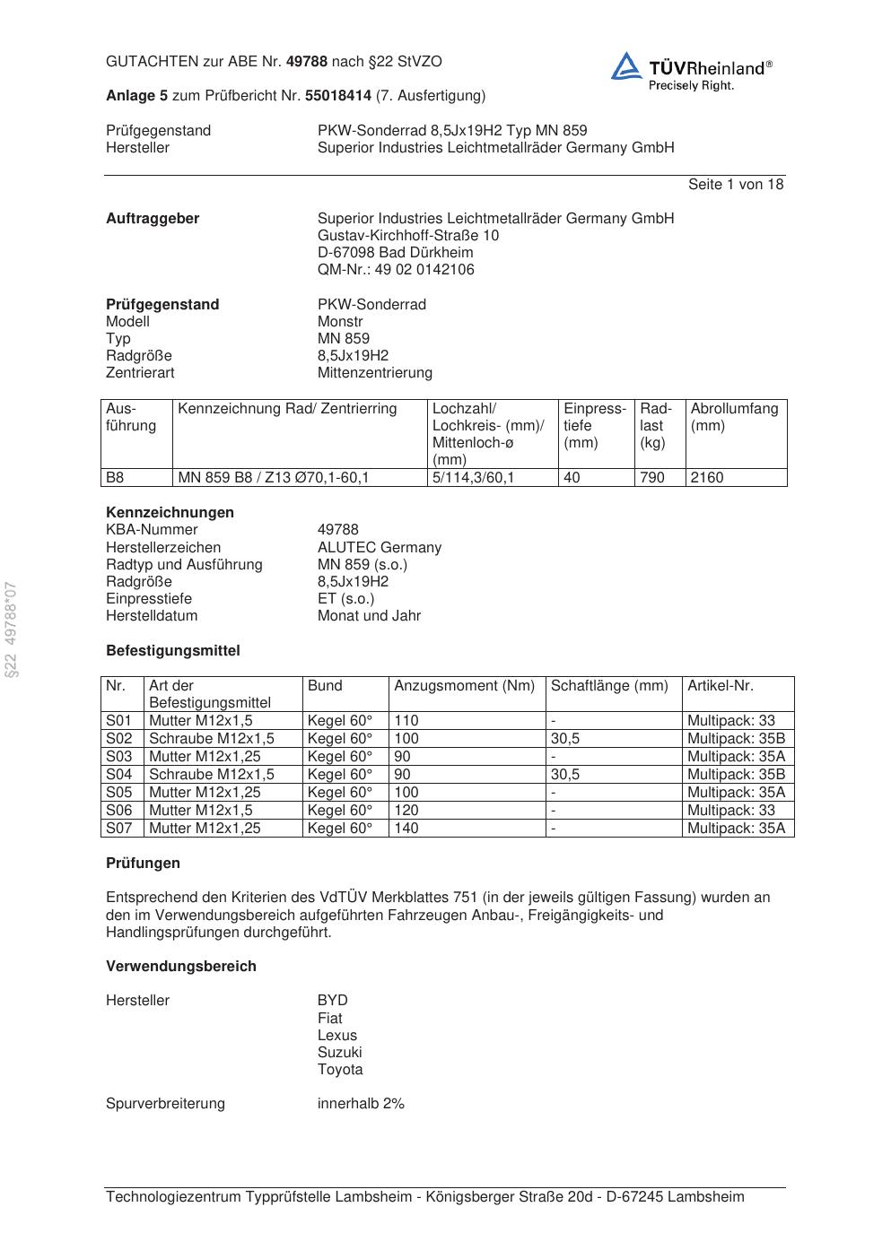 Dieses Gutachten (abe) bezieht sich auf die Alufelge ALUTEC MN 859 in der Ausführung 8.5Jx19 ET 0, Mittenloch 0 mm (KBA 49788). Im PDF findest du typischerweise zulässige Reifengrößen, Auflagen/Anbauhinweise und – je nach Dokument – Hinweise zur Eintragung.