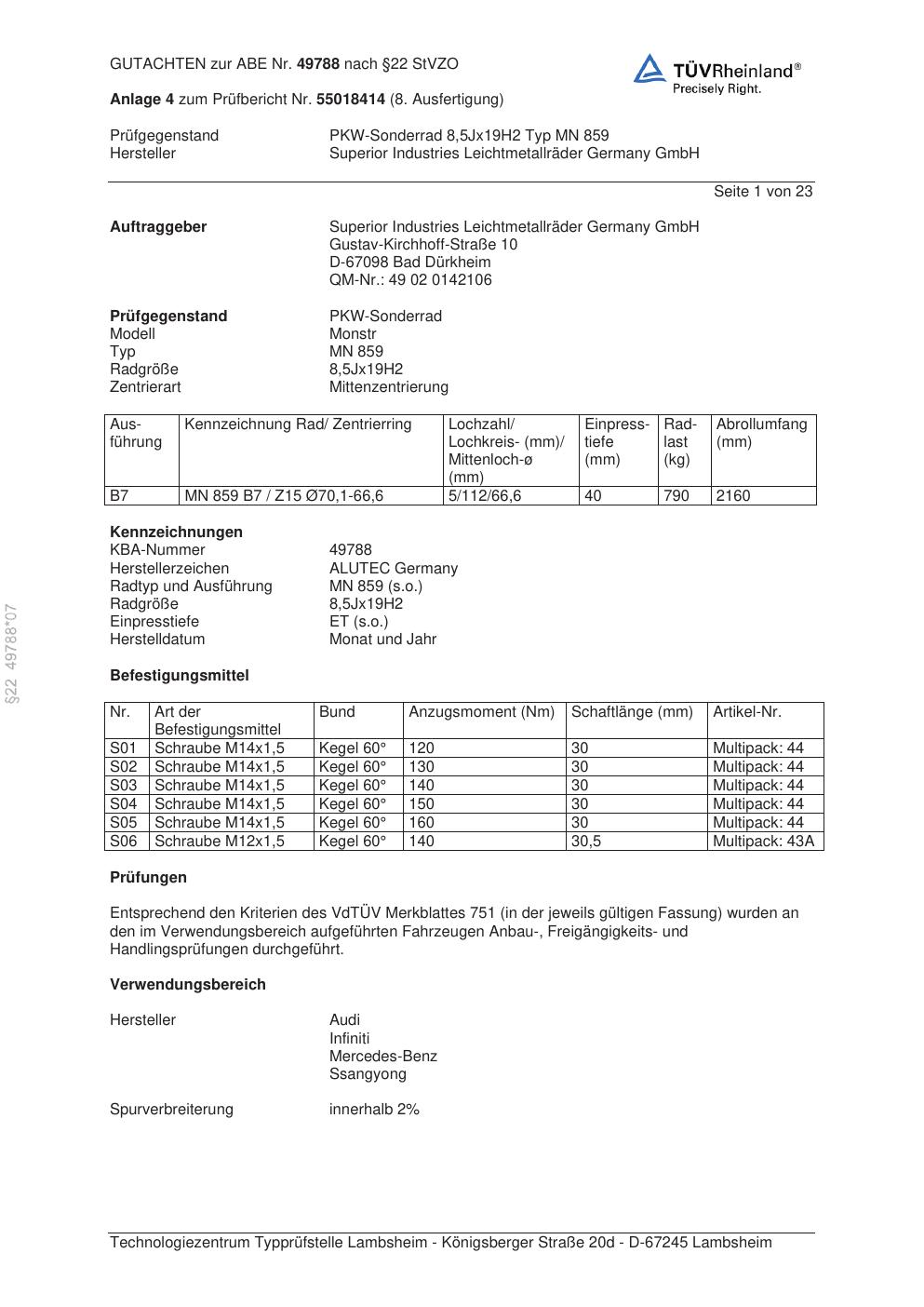 Dieses Gutachten (abe) bezieht sich auf die Alufelge ALUTEC MN 859 in der Ausführung 8.5Jx19 ET 0, Mittenloch 0 mm (KBA 49788). Im PDF findest du typischerweise zulässige Reifengrößen, Auflagen/Anbauhinweise und – je nach Dokument – Hinweise zur Eintragung.