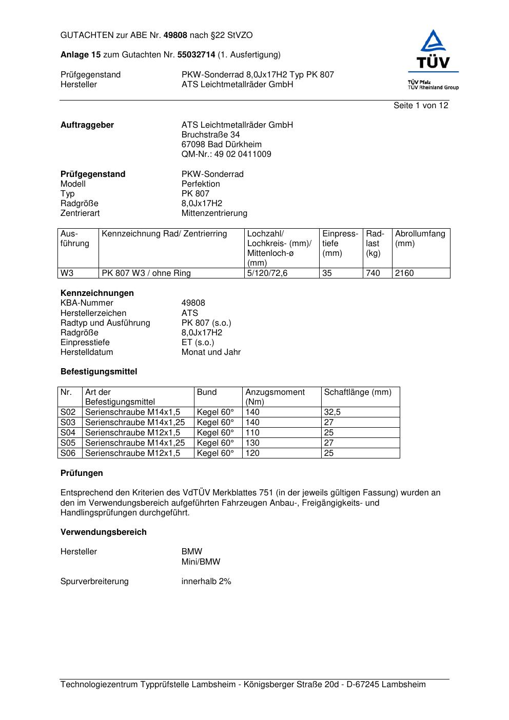 Dieses Gutachten (abe) bezieht sich auf die Alufelge ATS PK 807 in der Ausführung 8Jx17 ET 0, Mittenloch 0 mm (KBA 49808). Im PDF findest du typischerweise zulässige Reifengrößen, Auflagen/Anbauhinweise und – je nach Dokument – Hinweise zur Eintragung.