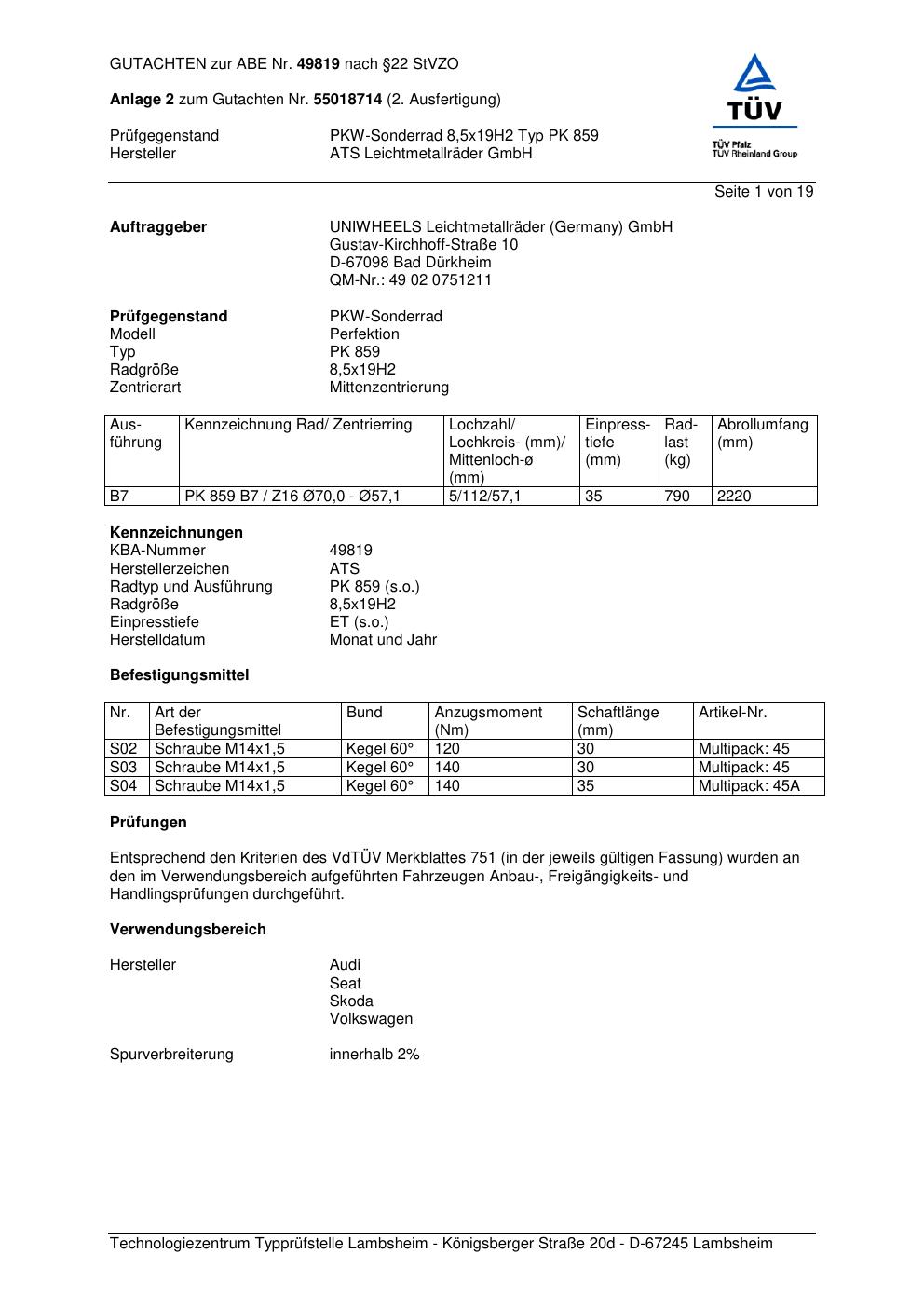 Dieses Gutachten (abe) bezieht sich auf die Alufelge ATS PK 859 in der Ausführung 8.5Jx19 ET 0, Mittenloch 0 mm (KBA 49819). Im PDF findest du typischerweise zulässige Reifengrößen, Auflagen/Anbauhinweise und – je nach Dokument – Hinweise zur Eintragung.