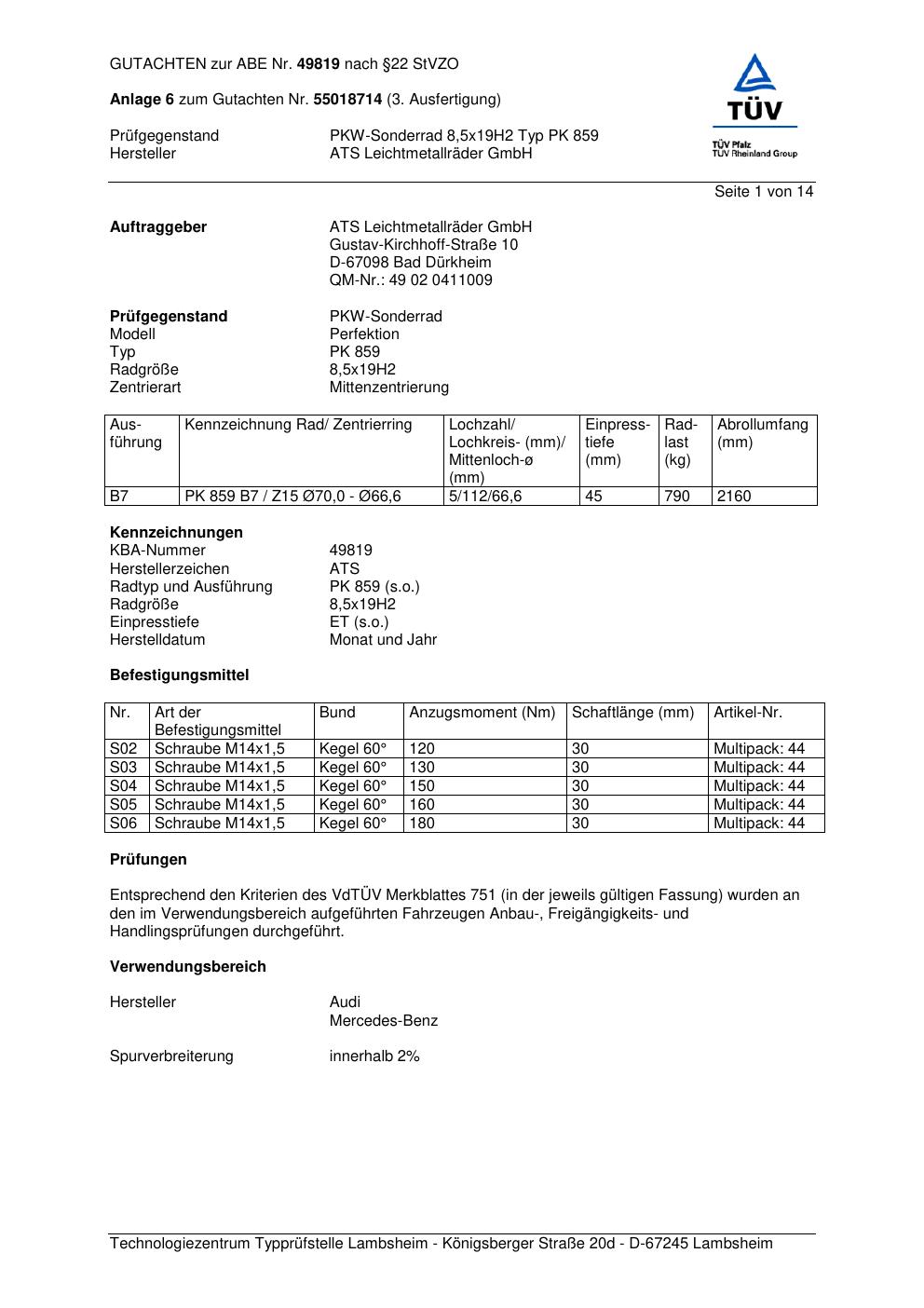 Dieses Gutachten (abe) bezieht sich auf die Alufelge ATS PK 859 in der Ausführung 8.5Jx19 ET 0, Mittenloch 0 mm (KBA 49819). Im PDF findest du typischerweise zulässige Reifengrößen, Auflagen/Anbauhinweise und – je nach Dokument – Hinweise zur Eintragung.