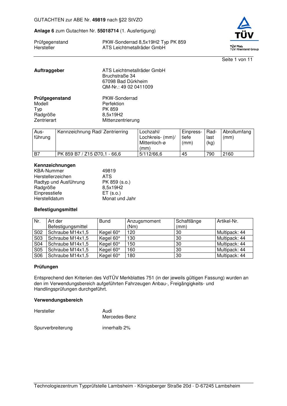 Dieses Gutachten (abe) bezieht sich auf die Alufelge ATS PK 859 in der Ausführung 8.5Jx19 ET 0, Mittenloch 0 mm (KBA 49819). Im PDF findest du typischerweise zulässige Reifengrößen, Auflagen/Anbauhinweise und – je nach Dokument – Hinweise zur Eintragung.