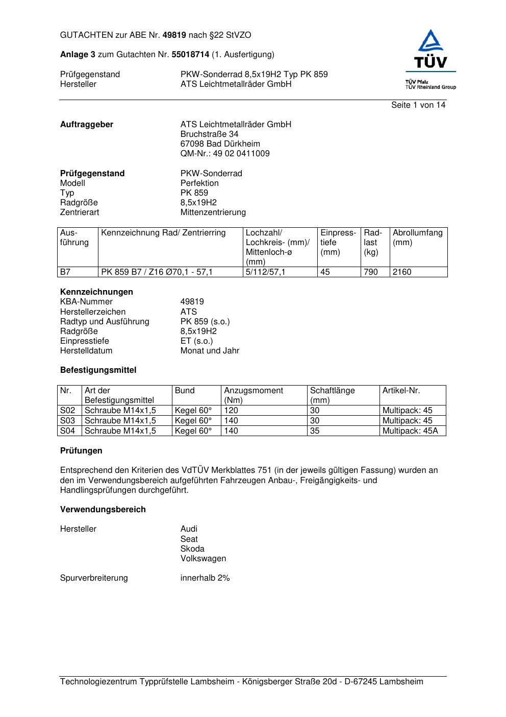 Dieses Gutachten (abe) bezieht sich auf die Alufelge ATS PK 859 in der Ausführung 8.5Jx19 ET 0, Mittenloch 0 mm (KBA 49819). Im PDF findest du typischerweise zulässige Reifengrößen, Auflagen/Anbauhinweise und – je nach Dokument – Hinweise zur Eintragung.