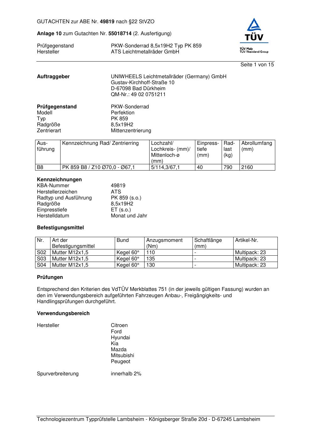 Dieses Gutachten (abe) bezieht sich auf die Alufelge ATS PK 859 in der Ausführung 8.5Jx19 ET 0, Mittenloch 0 mm (KBA 49819). Im PDF findest du typischerweise zulässige Reifengrößen, Auflagen/Anbauhinweise und – je nach Dokument – Hinweise zur Eintragung.