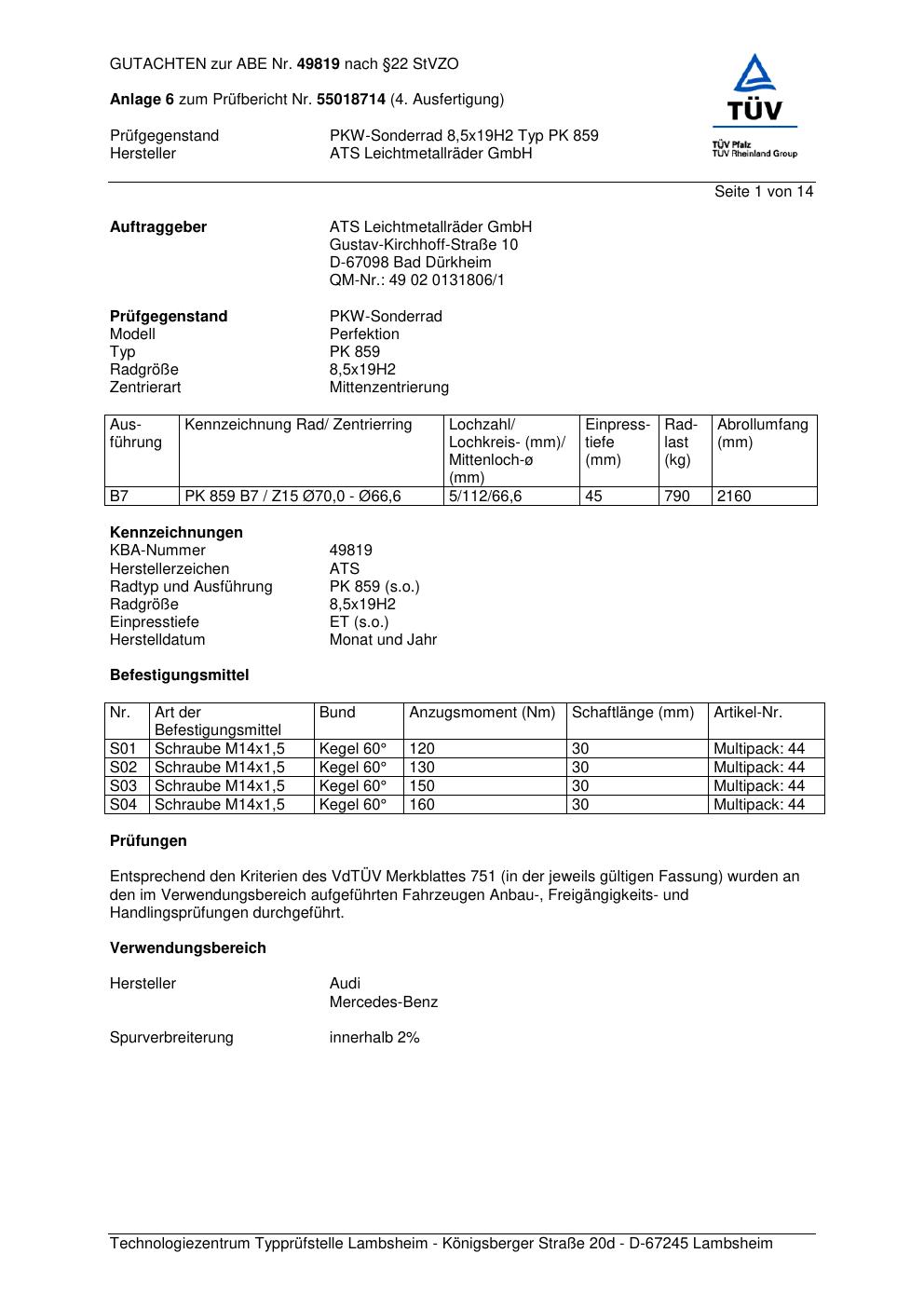 Dieses Gutachten (abe) bezieht sich auf die Alufelge ATS PK 859 in der Ausführung 8.5Jx19 ET 0, Mittenloch 0 mm (KBA 49819). Im PDF findest du typischerweise zulässige Reifengrößen, Auflagen/Anbauhinweise und – je nach Dokument – Hinweise zur Eintragung.