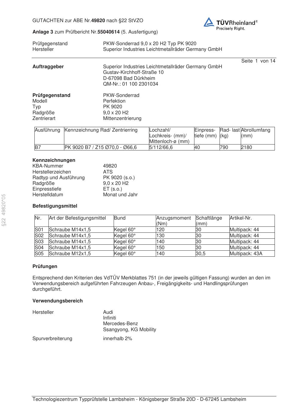 Felgengutachten / abe für Alufelgen ATS PK 9020 (9Jx2 ET 0, Mittenloch 0 mm) mit KBA 49820 (Zertifikatsnummer 49820). Hier kostenlos als PDF herunterladen. Der Download-Link ist 24 Stunden gültig und kann bis zu zwei Mal verwendet werden.
