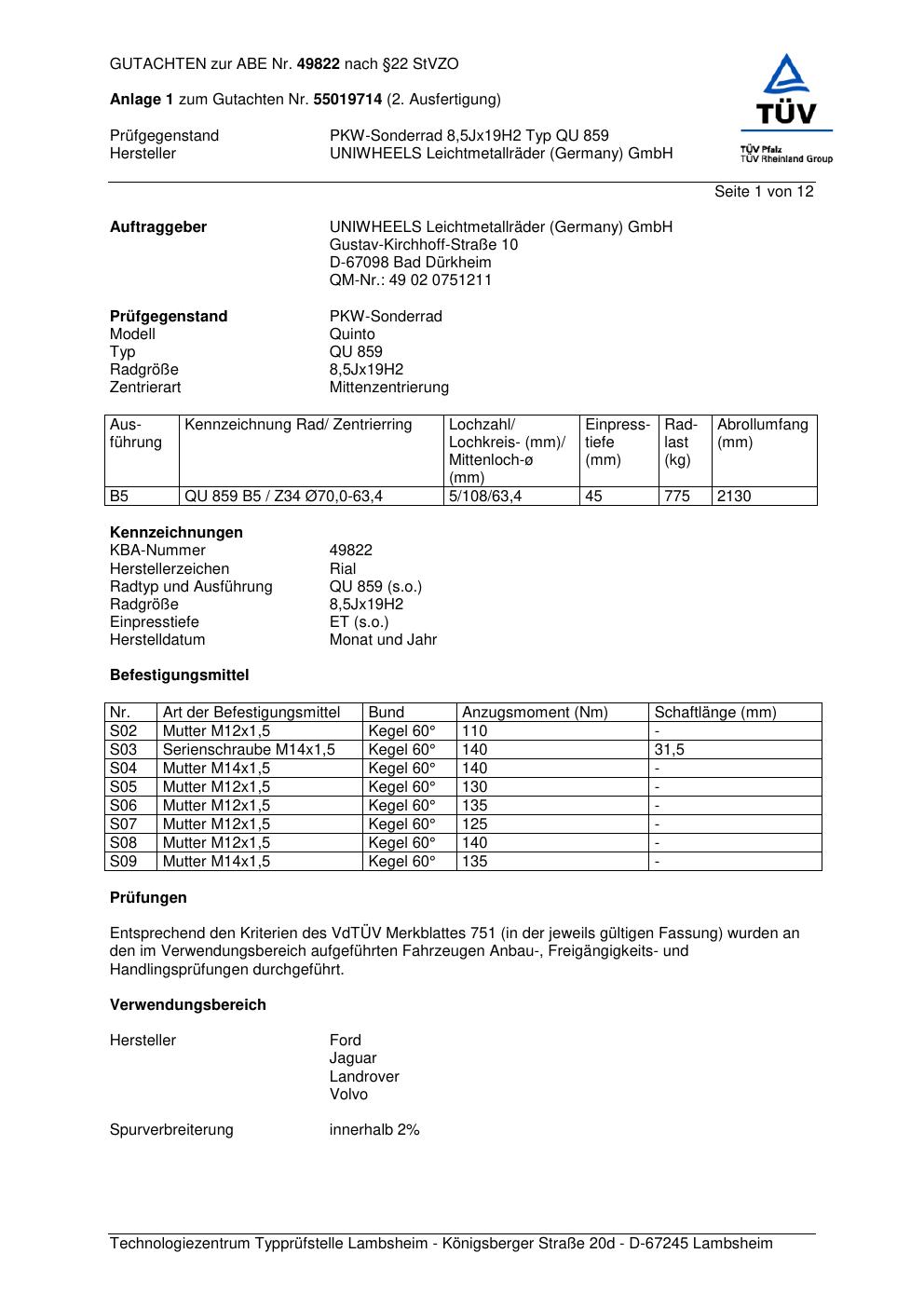Dieses Gutachten (abe) bezieht sich auf die Alufelge brand-rial QU 859 in der Ausführung 8.5Jx19 ET 0, Mittenloch 0 mm (KBA 49822). Im PDF findest du typischerweise zulässige Reifengrößen, Auflagen/Anbauhinweise und – je nach Dokument – Hinweise zur Eintragung.