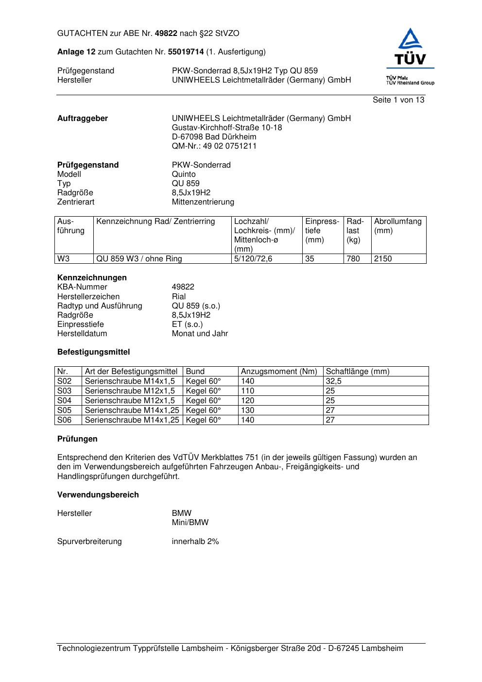 Dieses Gutachten (abe) bezieht sich auf die Alufelge brand-rial QU 859 in der Ausführung 8.5Jx19 ET 0, Mittenloch 0 mm (KBA 49822). Im PDF findest du typischerweise zulässige Reifengrößen, Auflagen/Anbauhinweise und – je nach Dokument – Hinweise zur Eintragung.