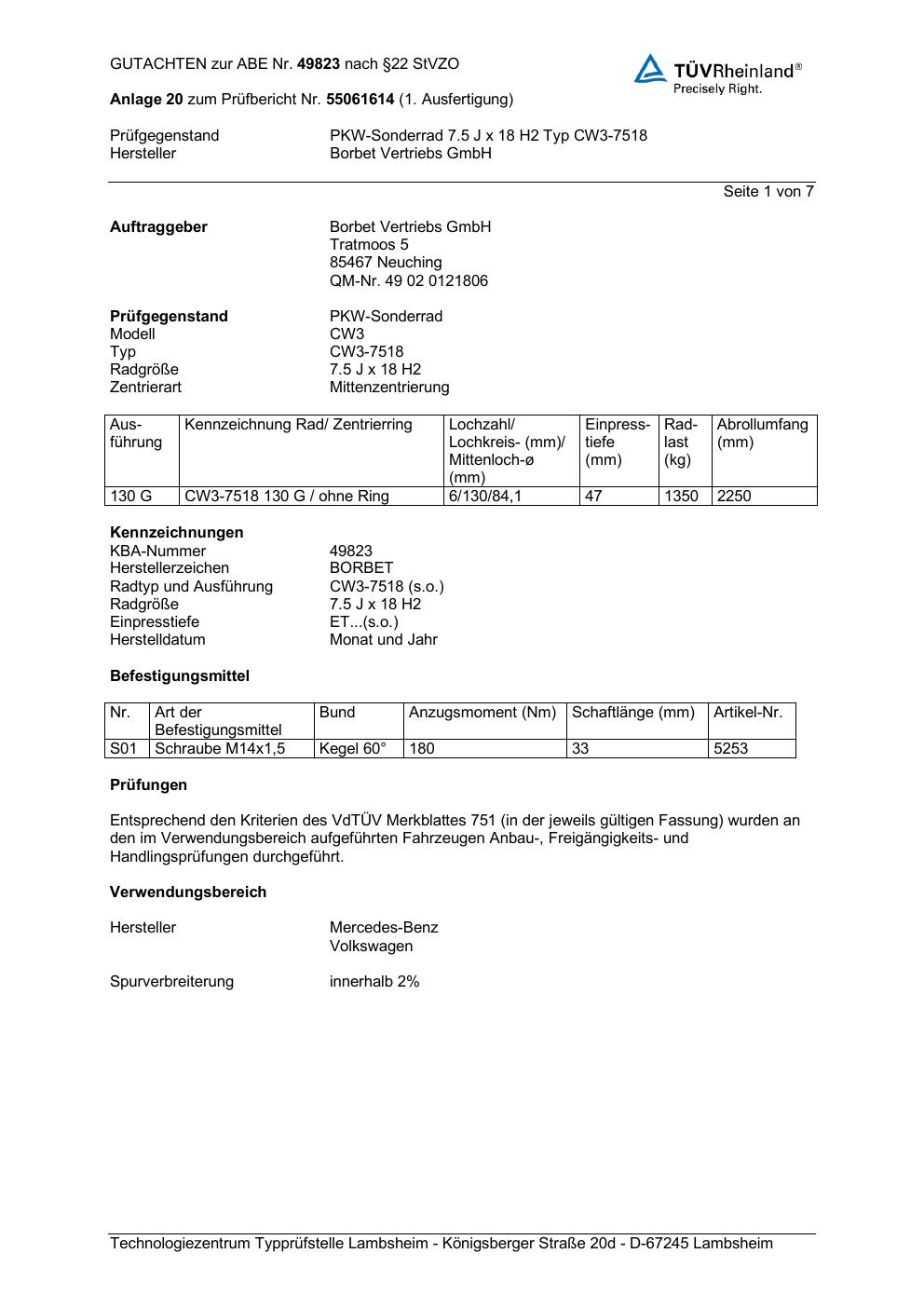 Dieses Gutachten (abe) bezieht sich auf die Alufelge Borbet CW3-751 8 in der Ausführung 7.5Jx18 ET 0, Mittenloch 0 mm (KBA 49823). Im PDF findest du typischerweise zulässige Reifengrößen, Auflagen/Anbauhinweise und – je nach Dokument – Hinweise zur Eintragung.