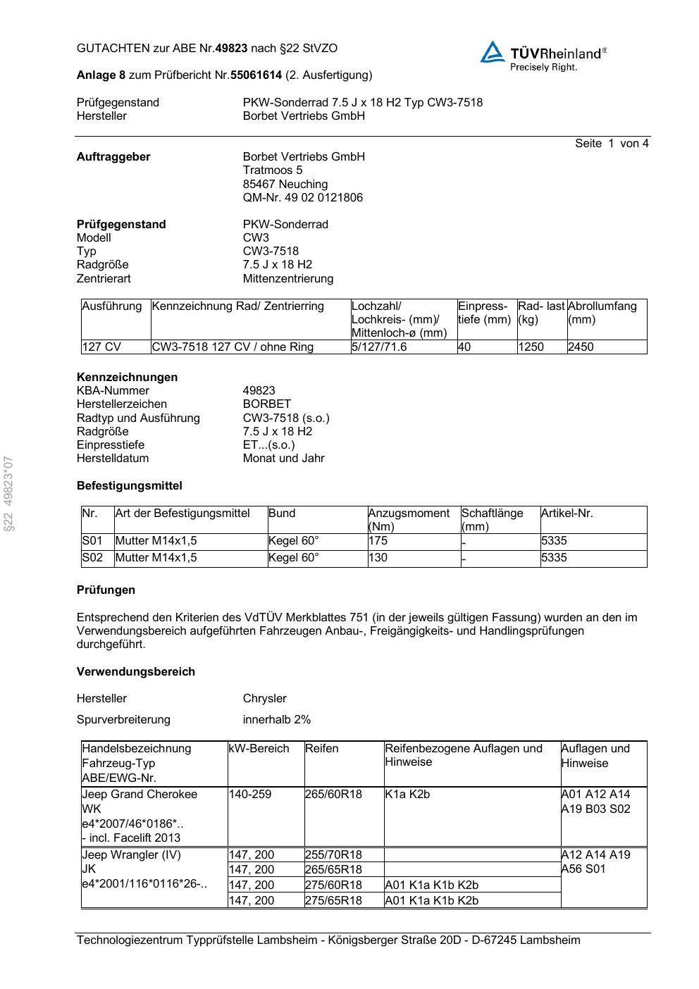 Dieses Gutachten (abe) bezieht sich auf die Alufelge Borbet CW3-751 8 in der Ausführung 7.5Jx18 ET 0, Mittenloch 0 mm (KBA 49823). Im PDF findest du typischerweise zulässige Reifengrößen, Auflagen/Anbauhinweise und – je nach Dokument – Hinweise zur Eintragung.