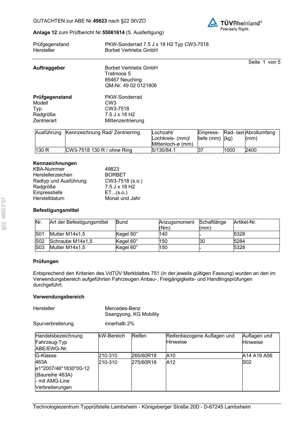 Dieses Gutachten (abe) bezieht sich auf die Alufelge Borbet CW3-751 8 in der Ausführung 7.5Jx18 ET 0, Mittenloch 0 mm (KBA 49823). Im PDF findest du typischerweise zulässige Reifengrößen, Auflagen/Anbauhinweise und – je nach Dokument – Hinweise zur Eintragung.