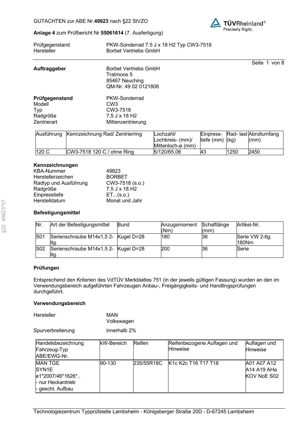 Dieses Gutachten (abe) bezieht sich auf die Alufelge Borbet CW3-751 8 in der Ausführung 7.5Jx18 ET 0, Mittenloch 0 mm (KBA 49823). Im PDF findest du typischerweise zulässige Reifengrößen, Auflagen/Anbauhinweise und – je nach Dokument – Hinweise zur Eintragung.