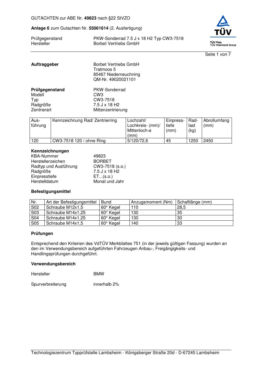 Dieses Gutachten (abe) bezieht sich auf die Alufelge Borbet CW3- 7518 in der Ausführung 7.5Jx18 ET 0, Mittenloch 0 mm (KBA 49823). Im PDF findest du typischerweise zulässige Reifengrößen, Auflagen/Anbauhinweise und – je nach Dokument – Hinweise zur Eintragung.