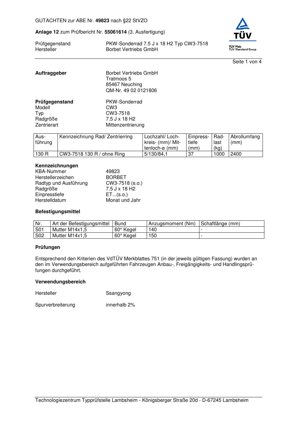 Dieses Gutachten (abe) bezieht sich auf die Alufelge Borbet CW3- 7518 in der Ausführung 7.5Jx18 ET 0, Mittenloch 0 mm (KBA 49823). Im PDF findest du typischerweise zulässige Reifengrößen, Auflagen/Anbauhinweise und – je nach Dokument – Hinweise zur Eintragung.